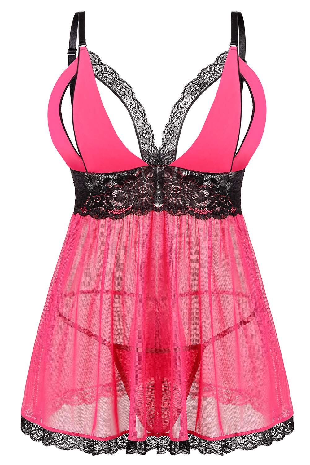 DonnallaDonnalla Plus Size Babydoll Lingerie Set for Women Sexy Mesh Lace Nightwear Adjustable Straps V Neck Chemise with Panty: Medium Pink
