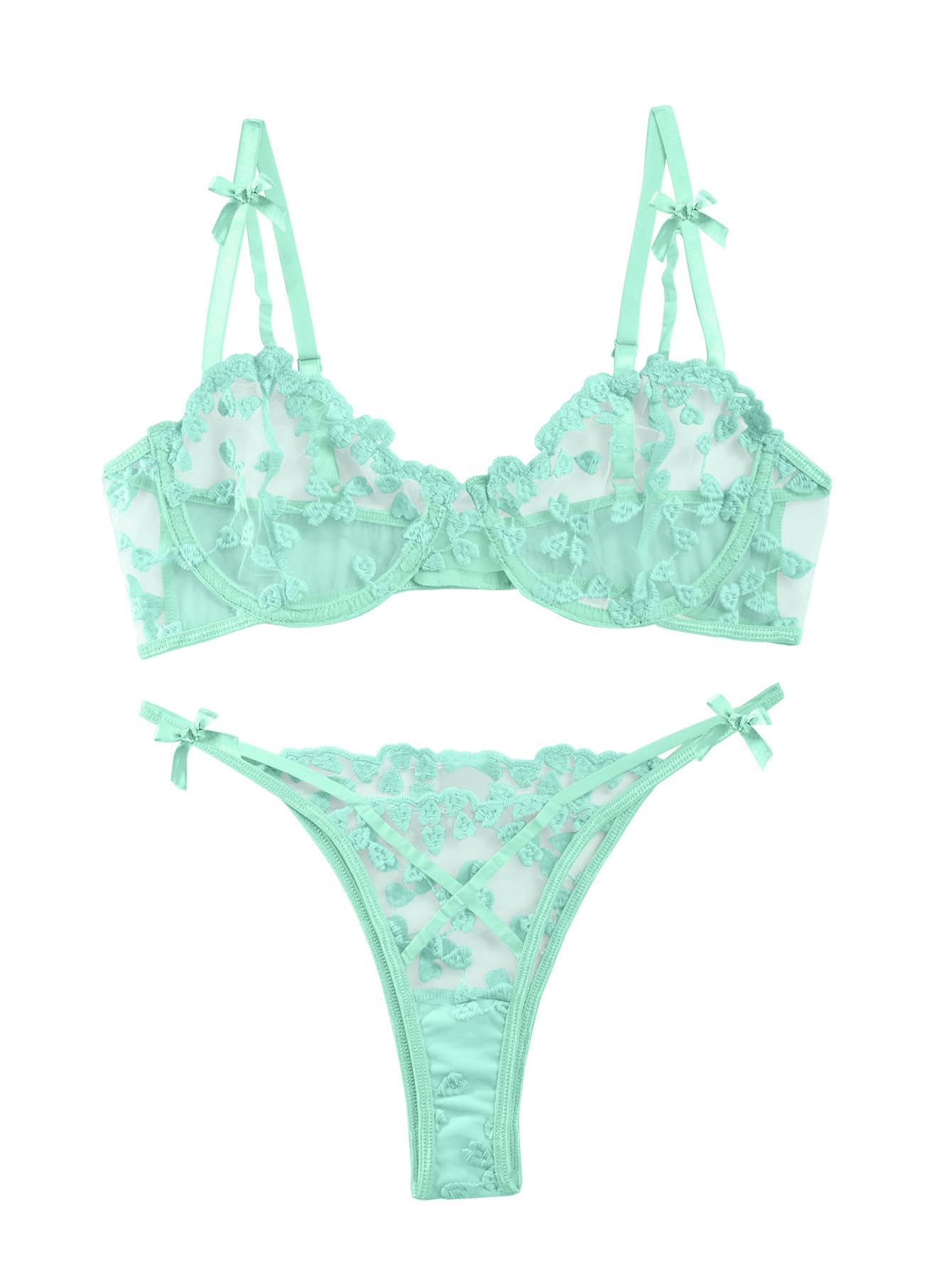 LilosyLilosy Sexy Underwire Cute Push Up Strappy Embroidered Mesh Sheer Lingerie Set See Through Panty Bra: Small Bow Mint Green