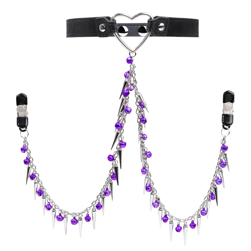 WOMLIGERIWOMLIGERI Nipple Clamps with Collar Necklaces Adjustable Leather Punk Chokers Heart Head Choker Non-Piercing Clips for Women: Purple Bells Rivets NP