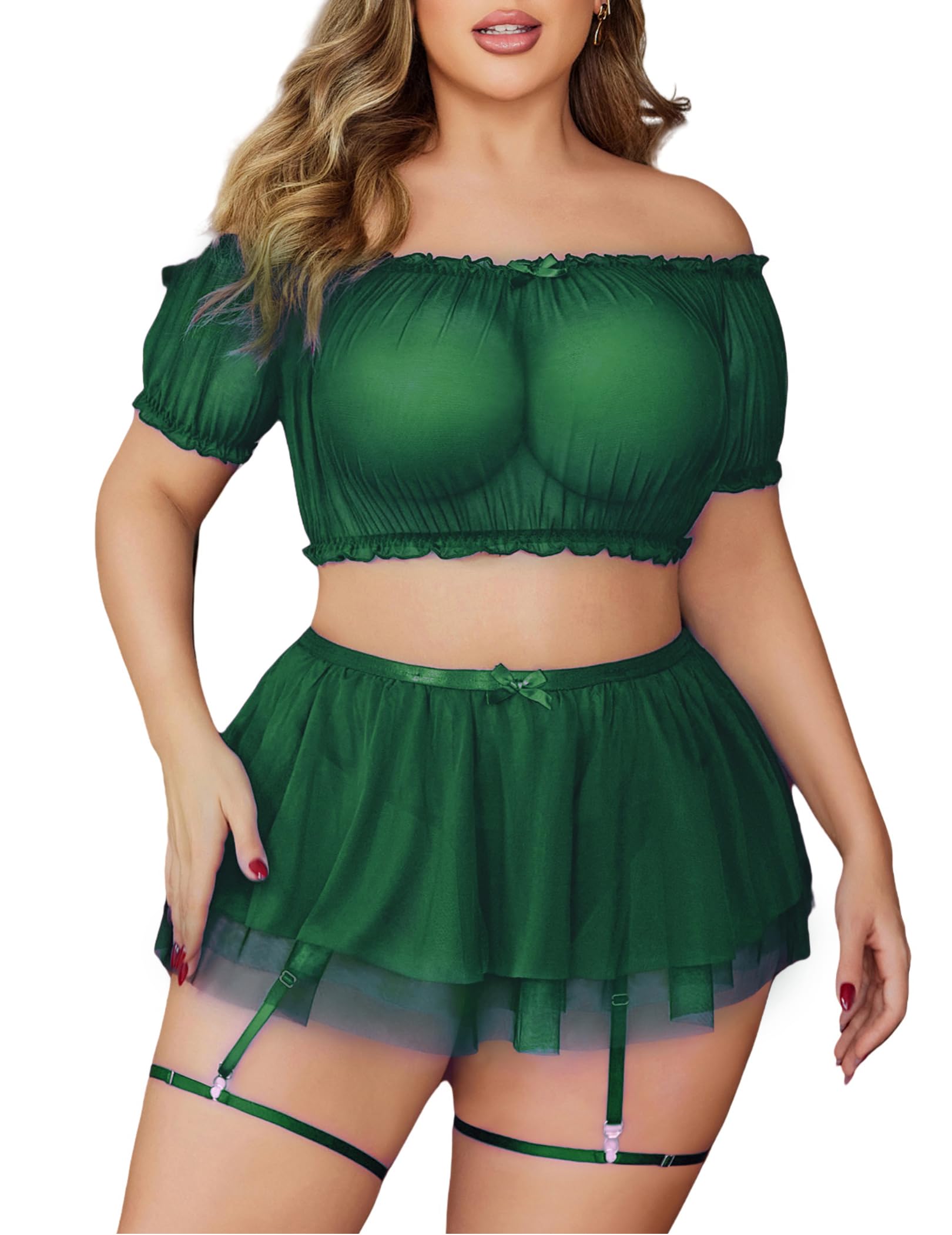 AvidloveAvidlove Plus Size Garter Lingerie Set Mesh Ruffle Cosplay Lingerie with Mini Skirt 3 Piece Lingerie Set: Green 24 Plus
