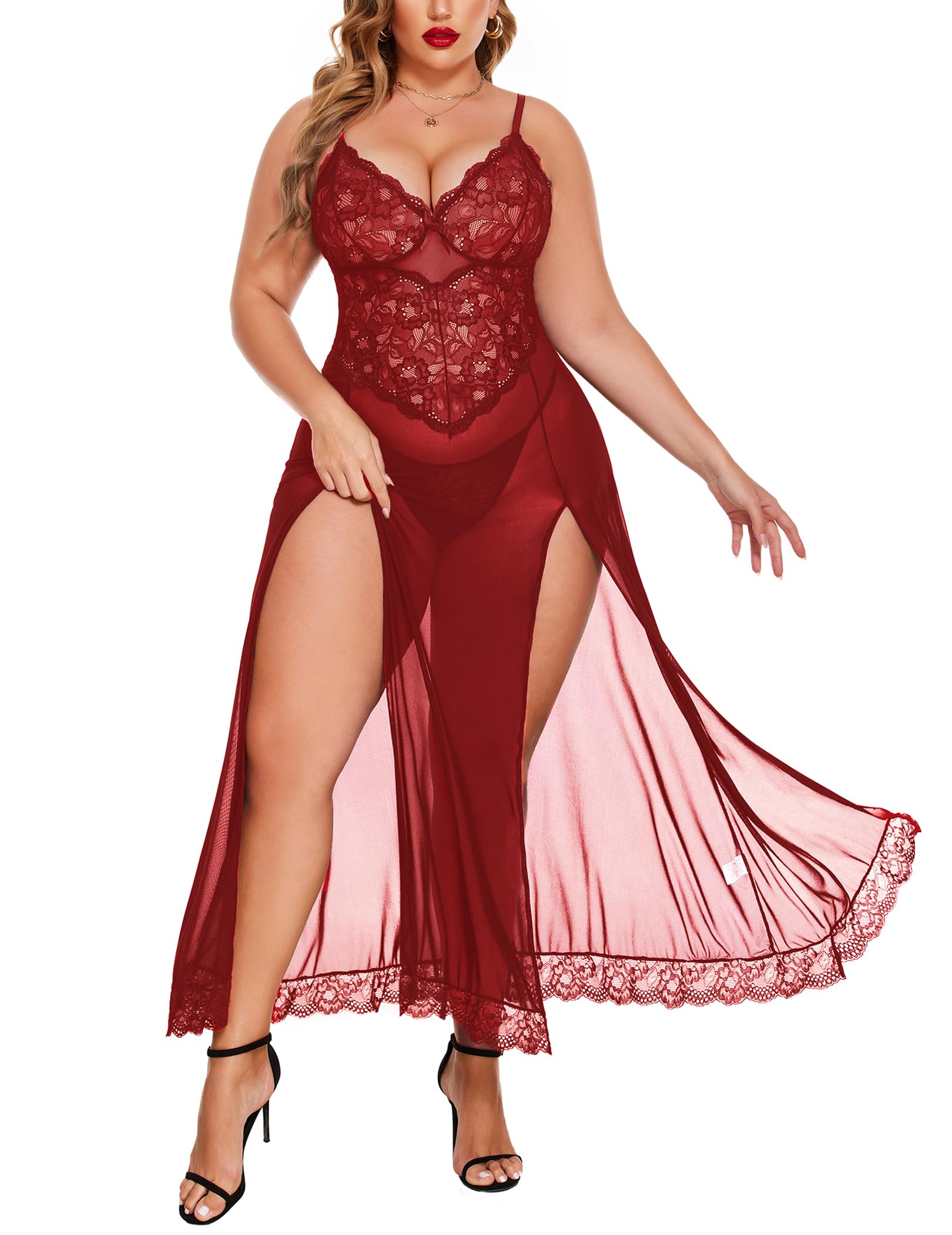 AvidloveAvidlove Plus Size Lingerie for Women Sexy Lace Babydoll Long Lingerie Dress Side Split Nightgown: Burgundy 3X-Large