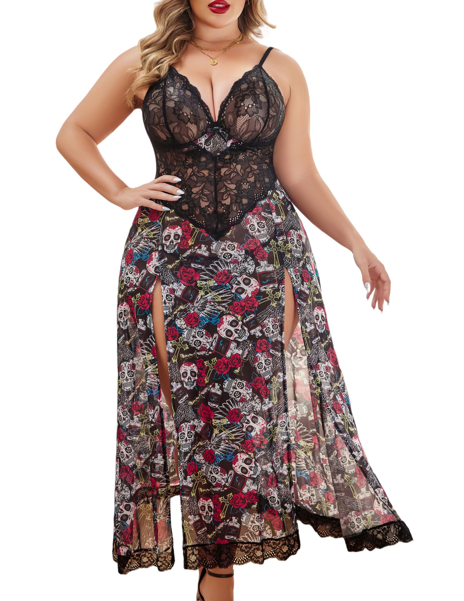 AvidloveAvidlove Plus Size Lingerie for Women Sexy Lace Babydoll Long Lingerie Dress Side Split Nightgown: Ghost Face Print 3X-Large