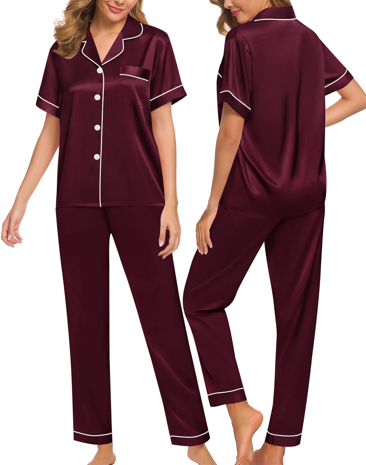 SWOMOG Women Satin Pajamas Set Short Sleeve Top & Pants Sleepwear Silky Button Down Nightwear 2pcs Loungewear Pjs Set