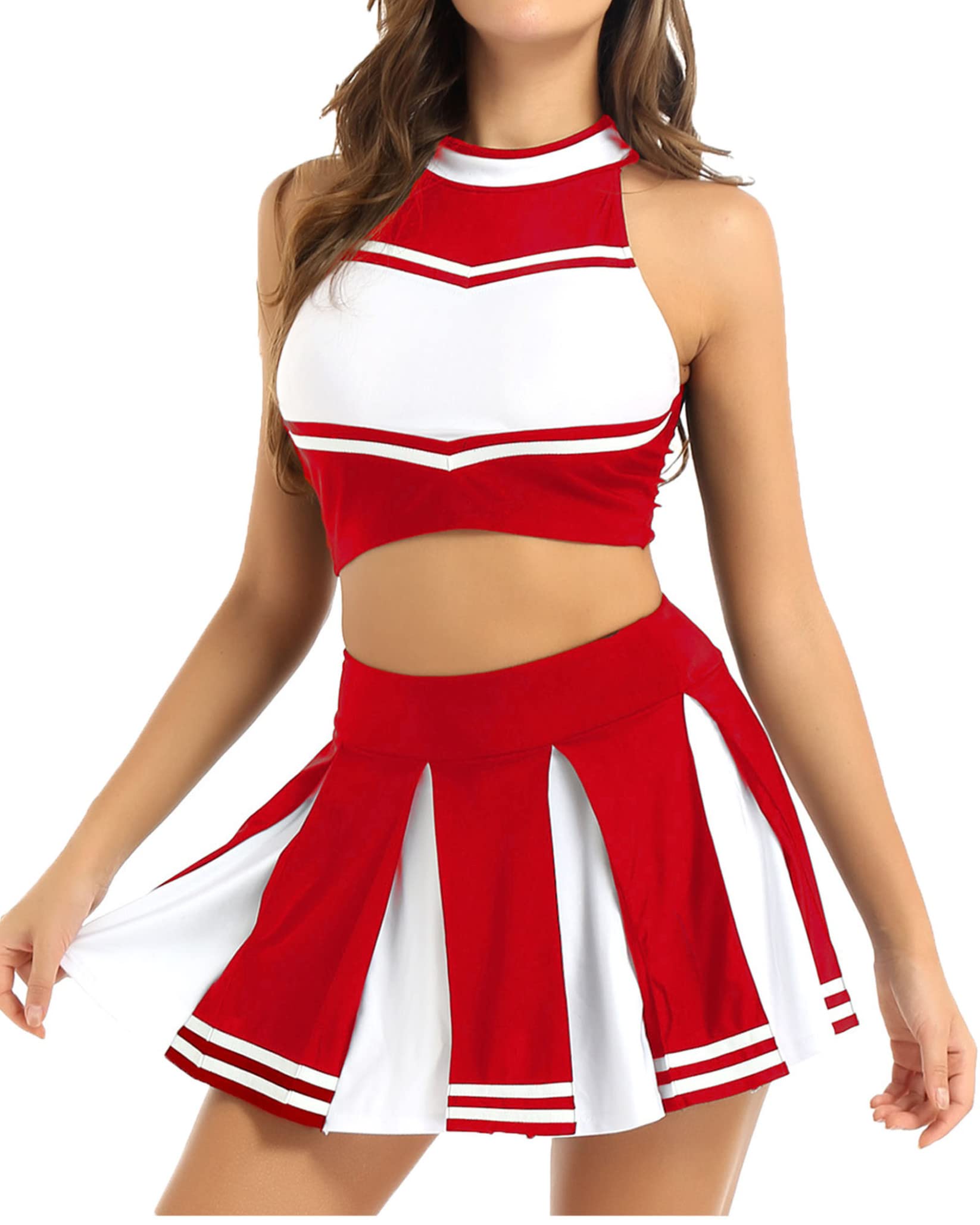 TSSOETSSOE Women Cheer Leader Costume Uniform Cheerleading Adult Dress Outfit Crop Top with Pleated Mini Skirt: X-Large Red