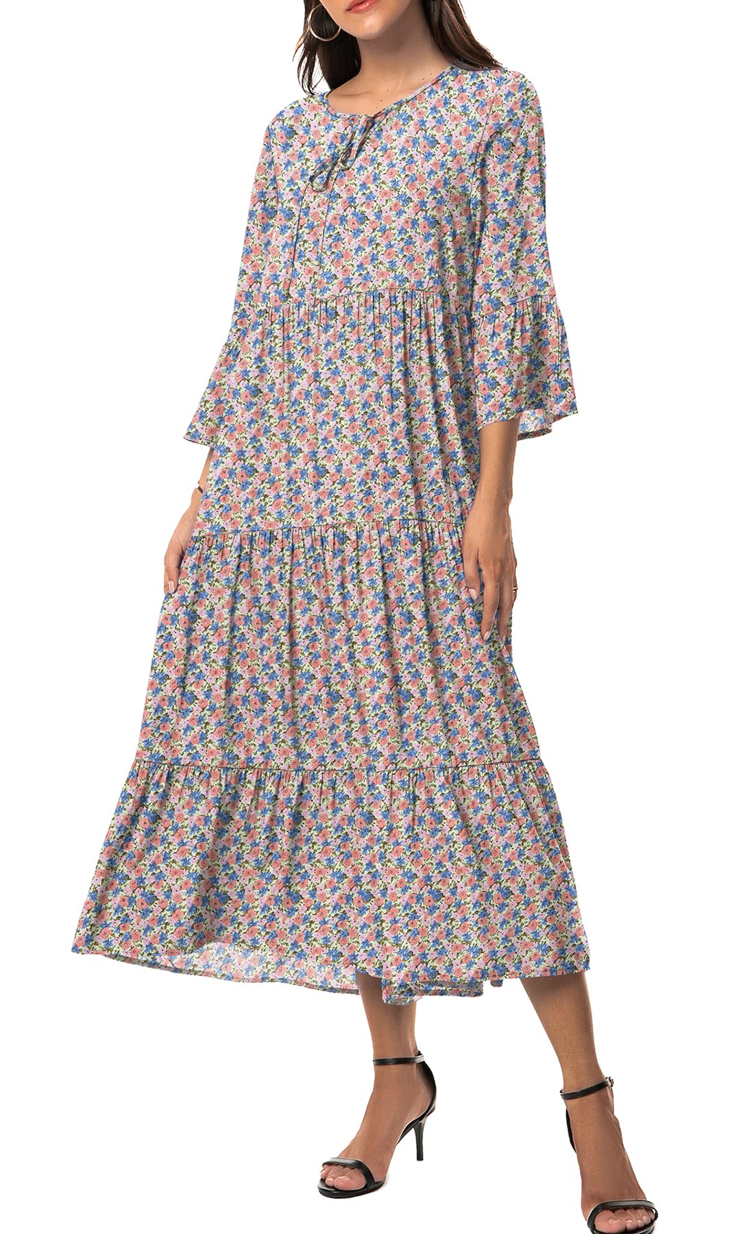 *VIISHOW Women's Summer 3/4 Sleeve Front Tie Neck Vintage Floral Print Ruffle Hem Casual Bohemian Flowy Midi Dress. *Type: 3/4 Ruffle Sleeve, relaxed fit, high waist, allover floral/ polk dot print, full length long maxi dress, it's very nice, you won't regret this purchase. * Pattern type: Floral Print. * Neckline: V Neck. * Sleeve length: 3/4 Ruffle Sleeve. * Sleek and sophisticated, this boho dress is made of lightweight, soft fabric that drapes beautifully for a flattering look. It features a v neckline, a empire waistline, 3/4 ruffle sleeves, ruffle hem and ankle length. This closet staple is also great all year-round. * They work as Day Dresses with Loose Style. Office, House, Garden, Shopping. You can wear them every day and everywhere. Soft and light Fabric are also comfy for Sleep Wear. Roomy Fitting are perfect for Maternity Dresses. * Stylish & comfortable, this beautiful dress is great year-round. Wear it with a jean jacket and sneakers for running errands or dress up with some great jewelry & heels for a night out. This dress would be great for maternity as well. * Perfect for Any Occasions: Christmas Gifts for Lady, Women, Girl, Mom, Sister, Suit for Work, Party, Usually Wear, Holiday, Spring, Summer, Fall, Winter. * Garment Care: Hand wash cold/ Do not bleach/ Hang or line dry. * Due to computer image resolution and monitor settings, colors may vary slightly depending on the website. ❀Material: This long midi dress is made of ployester and spandex fabric, which is soft, comfy and light weight, flowy, but not see through, ruffle hem and ankle length, this beautiful dress is great year-round. ❀Features: 3/4 Ruffle Sleeve/ High Waist/ Tiered Swing Skirt/ Ruffle Hem/ V-Neck/ midi dress/ Bohemian Style/ Classic Vintage Fashion/ Beach Dress/ Floral Print / Loose Fit/ Soft and Comfortable. ❀This Women's boho dress are in correct US size:Small=US size 4-6. Medium=US size 8-10. Large=US size 12-14. X-Large=US size 16-18. XX-Large=US size 20-22. ❀Elaborate design: Freely transformable tie neck design, it's cute and elegant when you tie up. Sexy v neck helps to frame your face, elongate the neck. Walking on streets or your garden on nights, breeze waving the skirts, you are taken to the boho hippie style of your youth, the happy leisure time, relaxed and funny. It is a great modern versatile dress for your wardrobe. ❀Matching & Occasion: Floral print dresses have simple styles and basic items that can make you look amazing. You can match it with all kinds of good-looking shoes, such as high-heeled sandals and flat-soled shoes. You can definitely accessorize up this dress to wear for various occasions, such as daily work/vacation/date/beach etc.