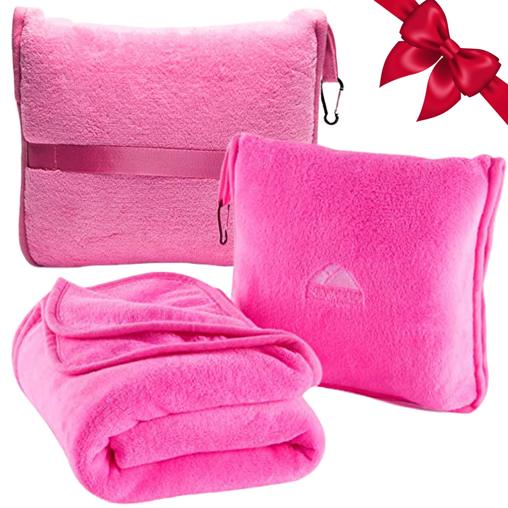 BlueHills Premium Soft Travel Blanket Pillow Airplane Blanket Packed in Soft Bag Pillowcase with Hand Luggage Belt and Backpack Clip, Compact Pack Large 2 in 1 Combo for Any Travel (Pink T004)