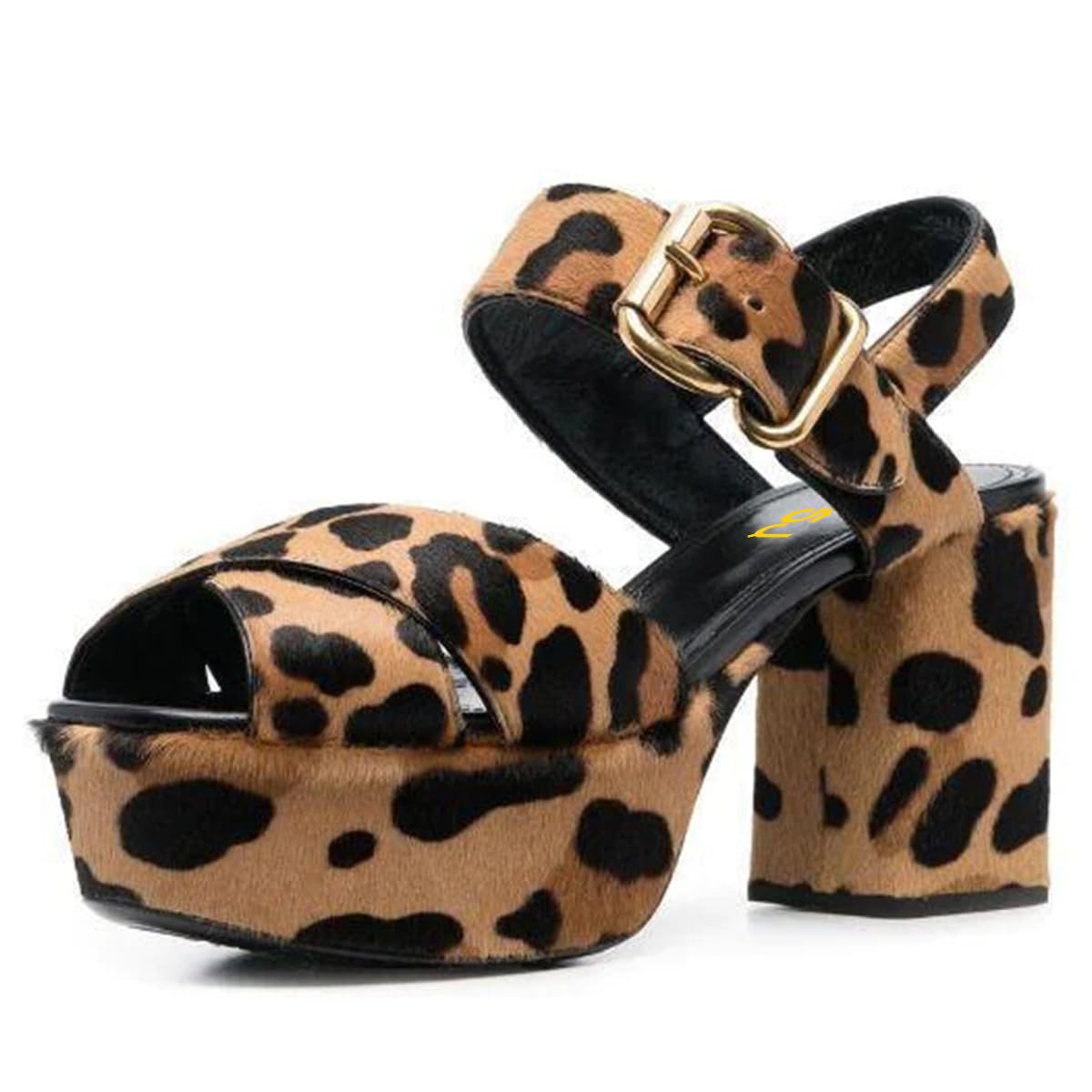 FSJ Women Peep Toe Chunky High Heels Platform Sandals Ankle Strap Velvet & Suede Summer Dress Wedding Prom Shoes Size 4-15 US: 13 Leopard Print