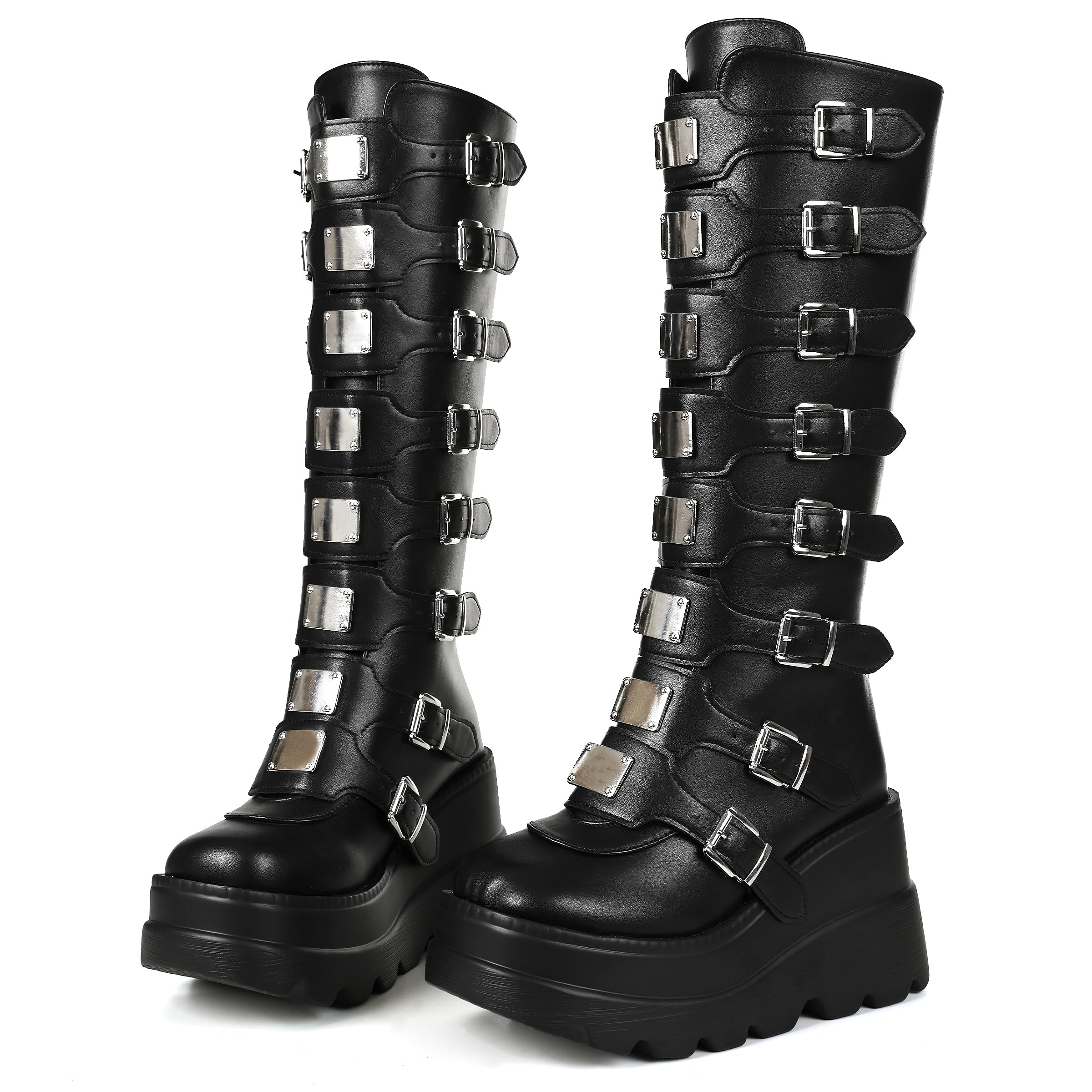CELNEPHO Womens Wedge Platform Knee High Boots High Heel Round-Toe Zip Punk Goth Mid Calf Combat Boots For Women