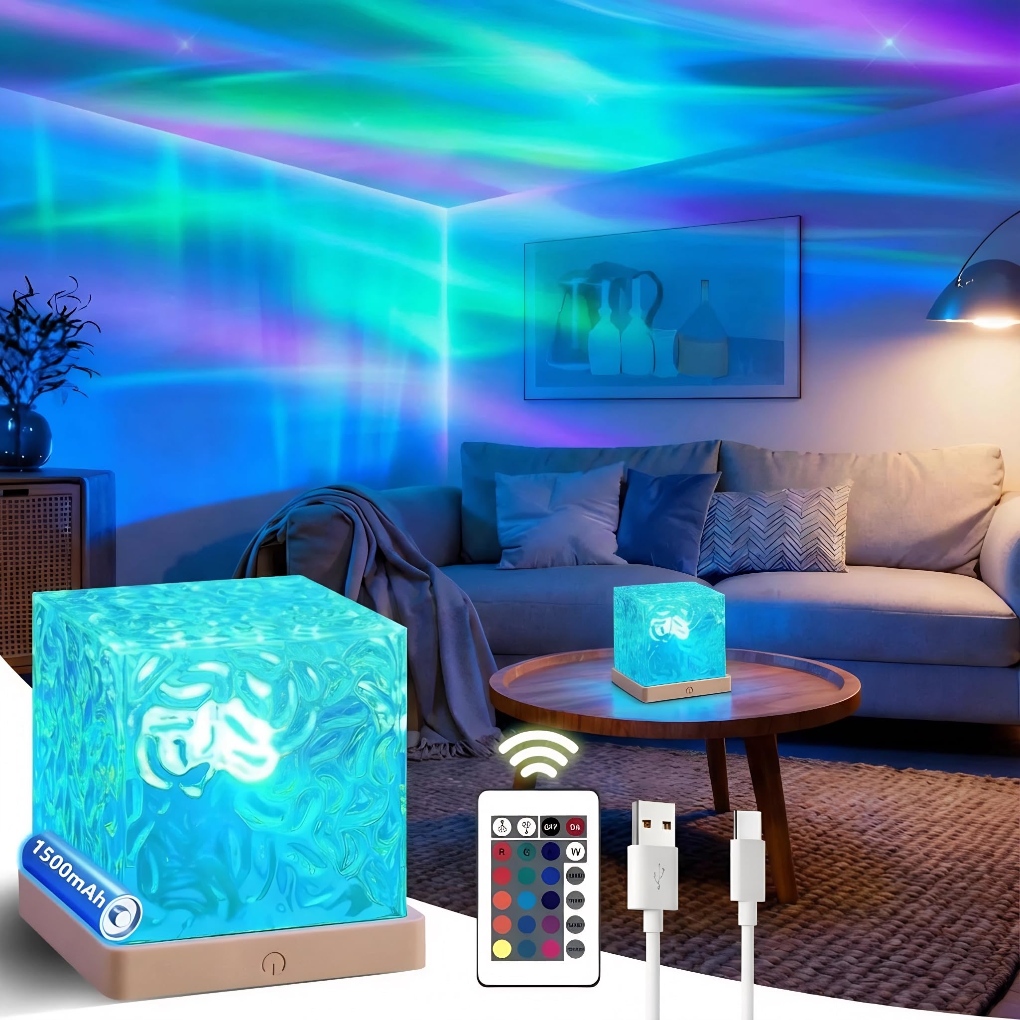 ⭐Transform your space into a serene oasis with the Ocean Wave Projector. This versatile, rechargeable ambient lamp combines the magic of northern lights, the tranquility of ocean waves, and the wonder of a galaxy projector in one sleek device. With 16 mesmerizing colors and 4 soothing modes—including water ripple, aurora, galaxy, and gentle glow—you can easily create the perfect atmosphere for sleep, relaxation, meditation, or play. ⭐Control your ambiance effortlessly using the included the responsive touch panel. Adjust colors, brightness, and modes from across the room—whether you're cozy in bed, hosting a gathering, or helping your child wind down.1500mAh battery provide up to 6 hours of runtime, so you can place it anywhere: bedside table, bookshelf, bathroom counter, or party space. ⭐Ideal for enhancing bedrooms, living rooms, nurseries, classrooms, yoga studios, and content creation setups, this projector adds a touch of elegance and calm to any decor style. Its realistic water ripple and slow-moving aurora effects also make it a popular choice as a jellyfish lamp or fish tank light alternative. ⭐More than just a lamp—it’s a experience. Give the gift of calm and wonder to yourself, your family, or a friend. Perfect for birthdays, holidays, self-care rituals, or simply turning everyday moments into something magical. 【16 Enchanting Colors That Bring the Ocean Indoors】Let the calming dance of ocean waves come alive in your space. This RGB crystal projector offers 16 dreamy colors with dynamic ripple effects, dimmable lighting, and 4 enchanting light modes—all adjustable by remote. The cube-shaped crystal lamp casts mesmerizing patterns that shift like water, helping you set the perfect mood or enhance your room’s style with a touch of magic. 【Two Gentle Ways to Control Your Light】The crystal wave lamp features a soft-touch button on its warm wooden base—just a light tap turns the lamp on and cycles through colors, while a longer press gently powers it off. You can also use the included remote for effortless control, adjusting brightness or switching between soothing light modes from across the room. (Tip: remember to remove the small plastic film from the remote before first use—it’s ready to go once that’s done!) 【Thoughtfully Crafted with Modern Elegance】Designed with simplicity and warmth in mind, this aurora lamp blends a sleek acrylic shade with a solid sturdy base. Its clean, minimalist look fits beautifully in any setting—whether it’s your bedroom, living room, bathroom, child’s playroom, or even a cozy reading nook. It’s more than a lamp; it’s a little piece of calm you can place wherever you need it. 【A Soothing Glow for Every Moment】More than just a night light, this galaxy projector creates a peaceful ambiance with 16 colors and 4 gentle motion effects. Watch as soft ripples flow across your walls and ceiling, wrapping the room in warmth and serenity. It’s ideal for quiet evenings, romantic moments, or helping little ones drift off to sleep with wonder in their hearts. Whether you’re unwinding after a long day or setting the scene for connection, this lamp brings comfort and charm to every corner. 【A Gift That Comes From the Heart】Struggling to find the perfect present? This “3-in-1” light is more than a gift—it’s an experience. Combining a galaxy projector, a calming night light, and ambient decor, it’s a thoughtful choice for family, friends, kids, teens, and loved ones. Perfect for birthdays, Valentine’s Day, Christmas, Mother’s Day, Father’s Day, anniversaries, or just because. It makes a lovely decorative accent in bedrooms, living rooms, nurseries, offices, hotels, or cafes—anywhere a little glow of joy is welcome.