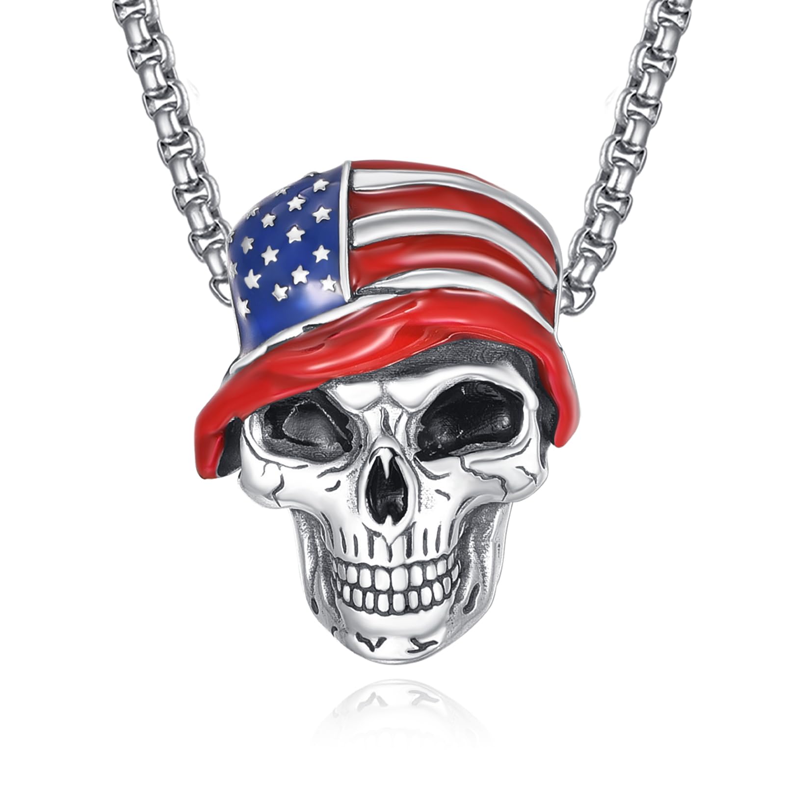 QCFL Skull Necklaces for Men, 925 Sterling Silver Mens Pendant Necklace, Cool Gothic Skull Jewelry Halloween Jewelry Gifts for Men Husband Him Father Son: American Flag
