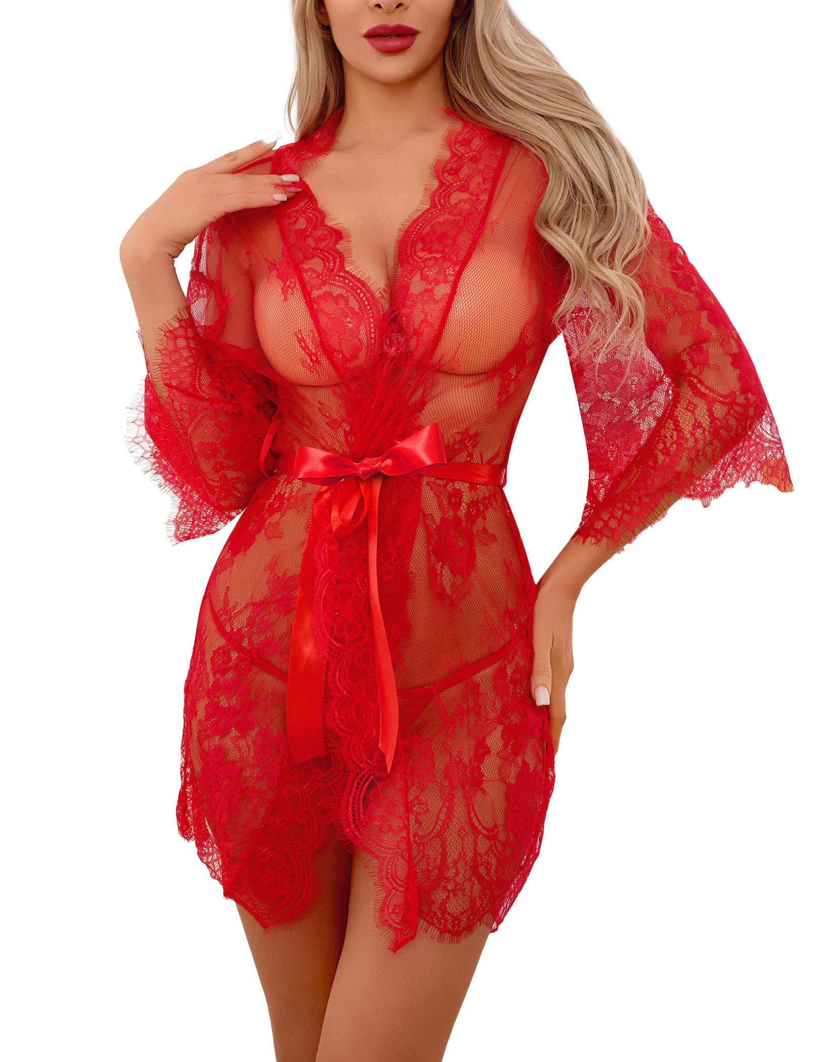 Narcisse Women's Lace Kimono Robe Mesh Nightgown Chemise Babydoll Cover Up Purple/Black/Red Robe with Belt