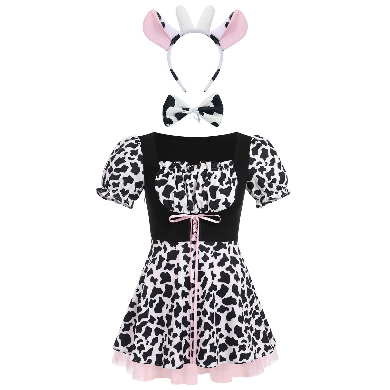◕‿◕。We offer you the best products. Women's Western Cowgirl Outfit Cow Costume Halloween Cosplay Outfit, keeping you comfortable and look stylish and sexy in every step. About this Item: ღ Condition: New With Tags ღ Package Include: 1PC Dress + 1PC Cow Ears Headband + 1PC Bowtie ღ Material: 90% Polyester + 10% Cotton ღ Features: Short Sleeve, Round/ Square Neck, Collect Waist, Cow Print, Ruffle, Hidden Side Zipper ღ Occasions: Perfect for Halloween, Space Cowgirl Costume, Alien Costumes, Clubs, Music Festivals, Rave Wear, Cosplay, Dancing, Performance Size Chart: The size is of manual measurement, please allow slight 1-3cm difference and refer to the details to choose the suitable size. Tag No.XS: Bust: 30.0" / 76cm; Waist: 27.0" / 68cm; Shoulder: 14.0" / 35cm; Dress Length: 30.0" / 77cm;Tag No.S: Bust: 31.0" / 80cm; Waist: 28.0" / 72cm; Shoulder: 14.0" / 36cm; Dress Length: 31.0" / 78cm;Tag No.M: Bust: 33.0" / 84cm; Waist: 30.0" / 76cm; Shoulder: 15.0" / 37cm; Dress Length: 31.0" / 79cm;Tag No.L: Bust: 35.0" / 88cm; Waist: 31.0" / 80cm; Shoulder: 15.0" / 38cm; Dress Length: 31.0" / 80cm;Tag No.XL: Bust: 36.0" / 92cm; Waist: 33.0" / 84cm; Shoulder: 15.0" / 39cm; Dress Length: 32.0" / 81cm;Tag No.XXL: Bust: 38.0" / 96cm; Waist: 35.0" / 88cm; Shoulder: 16.0" / 40cm; Dress Length: 32.0" / 82cm; Friendly Tips: Photo color might be a little different from the actual product due to color display of different monitors. Care Instructions: Wash in Cold Water. No Bleach. Hang to Dry or Tumble Dry Low. Anime Halloween Cow Costume for Women: Pretty and attractive milk cow costume women anime lolita cosplay kawaii cow girls outfits 4 piece cow print womens clothing set included cow print dress and cow ears headband bowtie, so cute cow costume and moo vibes makes you more lovely on Halloween costumes party. Deluxe cow print dress for women can dress up as cowgirl Halloween costume adult, western cowboy cowgirl costumes for women; Women Cow Outfit Design: Women's anime cows print outfit cow roleplay costume, 3 piece cow clothes for women, just be a dairy cow. Cute cow maid cosplay costumes set. Classic pink lace up cow print dress, cute to match the cow ears headband and bowtie. Women cow costume matching with cow ears headband cosplay accessories. Lovely for Halloween cow cosplay, farm themed birthday outfit; Cute Halloween Cow Costume for Women: 3 Piece womens Anime cow costume western cowboy costume cowgirl costume, suitable to be anime cosplay costumes, animate outfit, club wear, anime cosplay costumes, party cosplay, Western party, Kawaii cow costume cosplay, cow maid apron outfit, milk cow anime costume, rave outfit for women festivals clothes, 80s costume for women, women Halloween cowboy costume, western themed birthday dress for women etc. Select Size: Western style cow costumes for women Anime cow outfit set for adult women, available in sizes XS, S, M, L, XL, 2XL. Adorable cow print, just be a charming dairy cow for cosplay party. Farm animals cow maid cow printed clothes. Cute role-playing anime cow suit, Vintage style adult 80s costume for women, cowgirl outfits for women, animal print outfits for women, cow costume adult, cow cosplay outfits for women, kawaii outfit for women, western cowgirl outfit women etc. Occasion: Retro adult cow costume cowgirl Halloween costumes for women, women's cute anime cow cosplay costume for Anime fans, for Halloween, music festival, cowgirl costume for women, rave party club outfit, cow outfit women, maid outfit for women, role play, animal costume for adults, cow Halloween costume, cow print outfit women, animal costume adult, cosplay costumes for women, cow ears costume, music festival clothing women, carnival, farm themed birthday photoshoot outfit.
