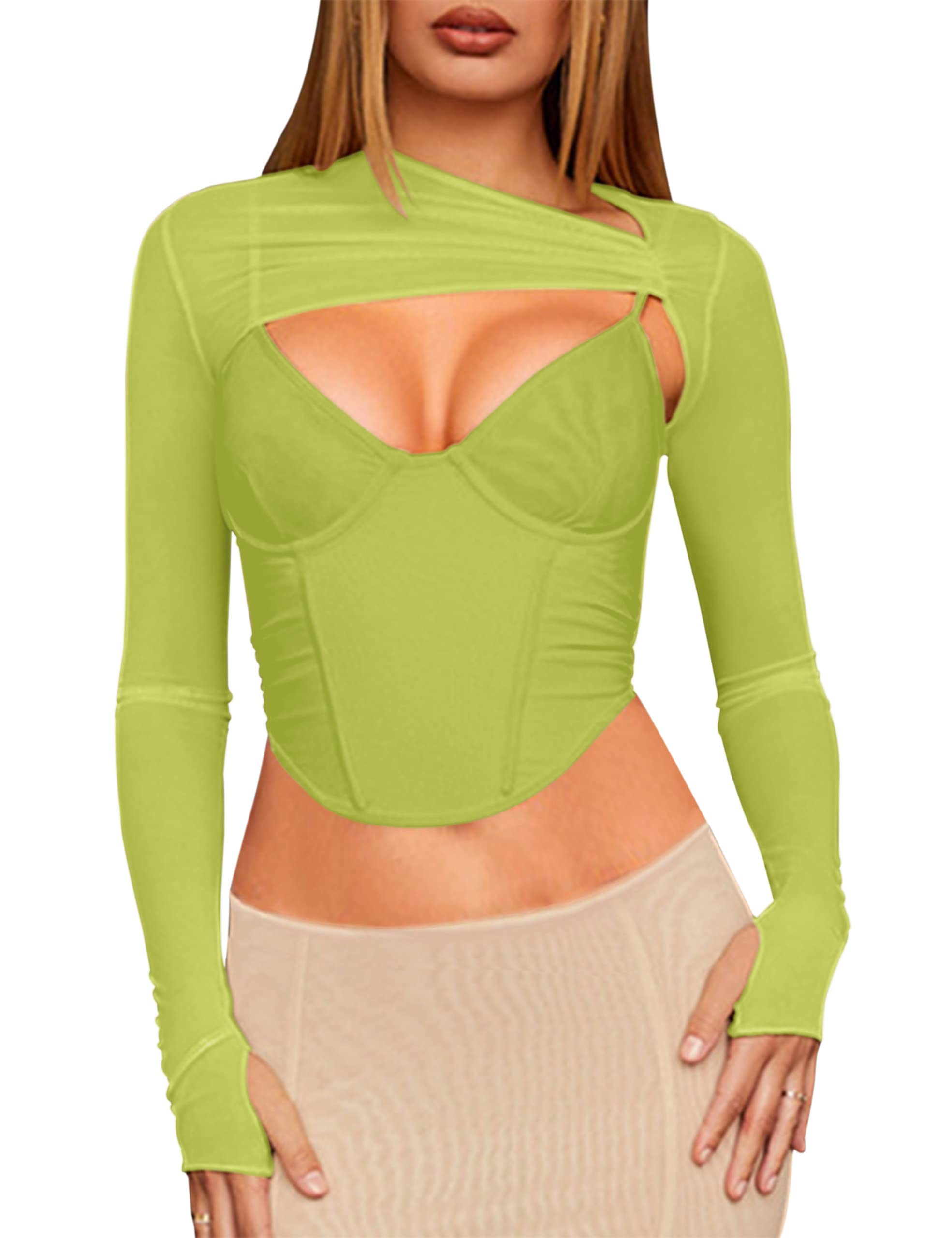 Meladyan Women Sexy Long Sleeve Mesh Crop Top Solid Cover Up Spaghetti Strap Slim Fit Corset Cami 2 pieces Clubwear