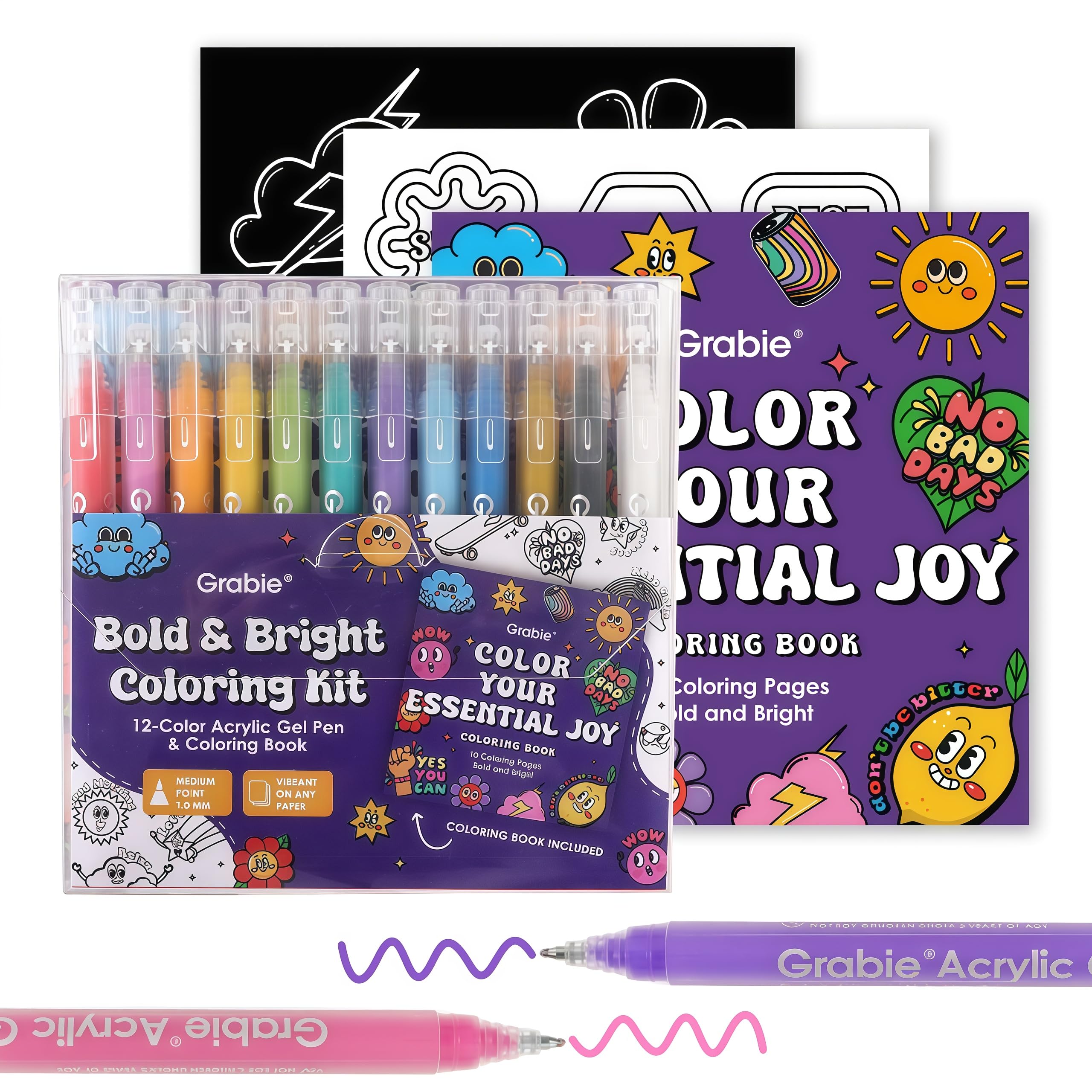 Grabie 12Colors Acrylic Gel Pens&Coloring Book, Medium Point Colored Gel Pens, Acrylic Gel Ink Pen Assorted Colored for Drawing, Note Taking, Bold&Bright Coloring Kit, Set of 12 (Sugar Rush Colors): Essential Colors