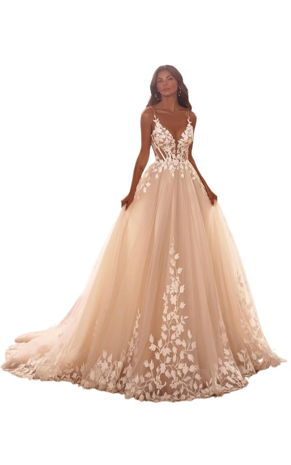 Zxruijing Women's Long Beach Wedding Dresses for Wedding 2025 Lace Applique Tulle Bridal Gowns HC013: Style4-champagne 16 Plus