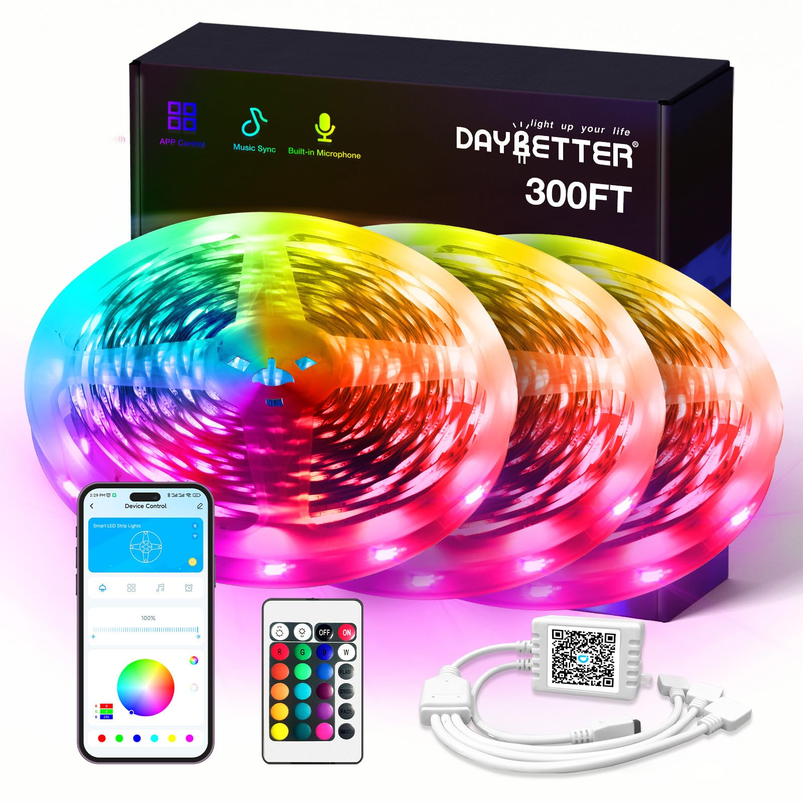 Smart App & IR Remote Control: With user-friendly 24-key IR remote and subscription-free DAYBETTER App, you can effortlessly adjust brightness, switch colors, and explore fun modes like flashing, quick, jump, and fade Music Sync LED Strip Lights: Sync with your favorite music using the high-sensitivity mic. Choose from 16 million colors to create a cozy or vibrant vibe. Flicker-free, bright lighting, perfect for calming kids, movie nights, or parties Smart Timing Settings : With timer function, our luces LED para cuarto remember your last setting and automatically turn on and off 132FT Extra Long LED Strip: Easily add vibrant lighting to large indoor spaces likes bedrooms, living rooms, kitchens, hallways, dorms boys gilrs teens, classrooms, and ceilings. Ideal for home decor, birthday gifts, wedding, holiday or Christmas Easy Installation: With strong adhesive, simply stick the LED room lights to any clean, dry surface in minutes. The flexible design makes installation effortless, even around corners and edges