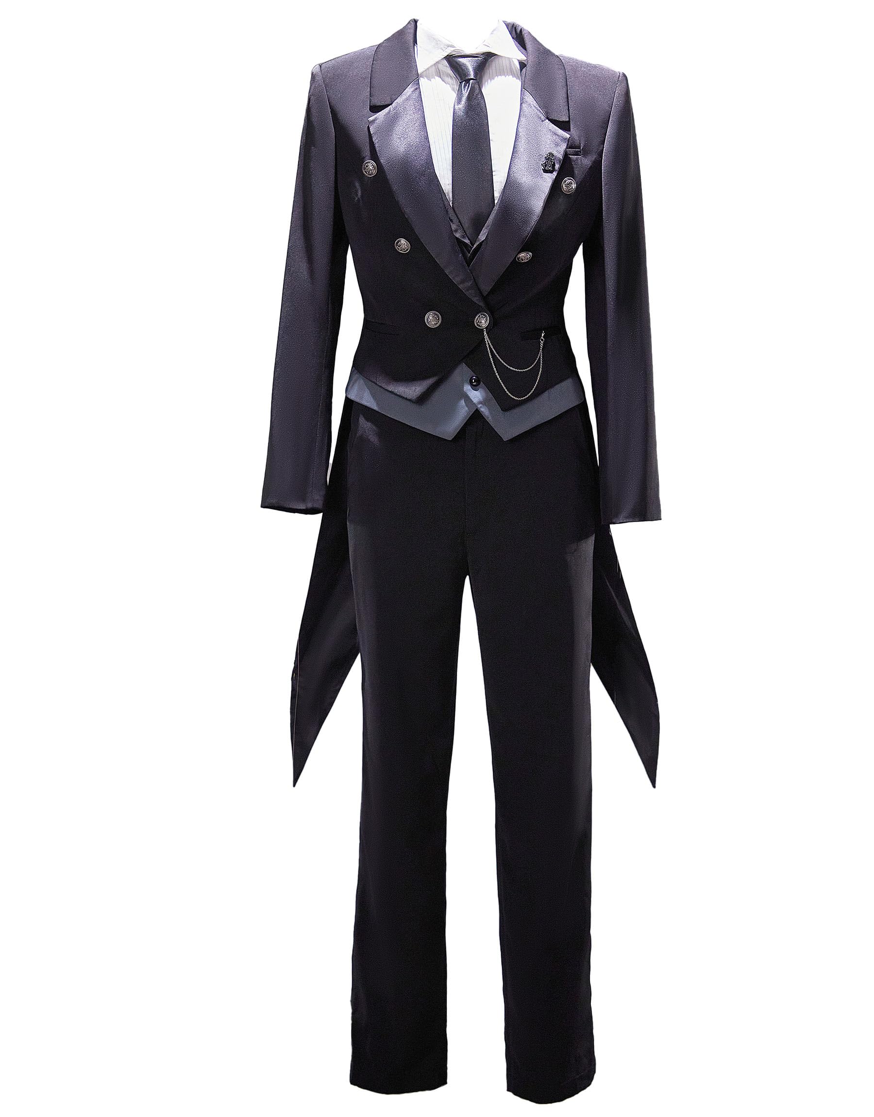 Unisex Cosplay Costume Size Chart (inch/cm) S size: Net Bust:37’’/94; Waist:31.5’’/80; Hips:39.8’’/101; Height:5'5"/165; Shoulder Width:19.2’’/48.8; Cuff:14.2’’/36; M size: Net Bust:39’’/99; Waist:33.5’’/85; Hips:41.7’’/106; Height:5'7"/170; Shoulder Width:20’’/50.8; Cuff:14.8’’/37.6 L size: Net Bust:42.9’’/109; Waist:37.4’’/95; Hips:45.7’’/116; Height:5'9"/175; Shoulder Width:21.6’’/54.8; Cuff:16.1’’/40.8. XL size: Net Bust:46.9’’/119; Waist:41.3’’/105; Hips:49.6’’/126; Height:5'11"/180; Shoulder Width:23.1’’/58.8; Cuff:17.3’’/44. Size: S, M, L, XL.(Please refer to the size chart in the product description) Included Items:Coat*1, Vest*1, Shirt*1, Tie*1, Gloves*2, Pants*1, Necklace*1, Brooch*1. Design: Butler Cosplay Costume Uniform Tuxedo Shirt Pants and Vest with Brooch. This tuxedo suit will bring a fashionable touch to your look and will definitely suit all styles and seasons. Occasions: It is perfect for Cosplay Party, Halloween, Carnival, Easter, etc.