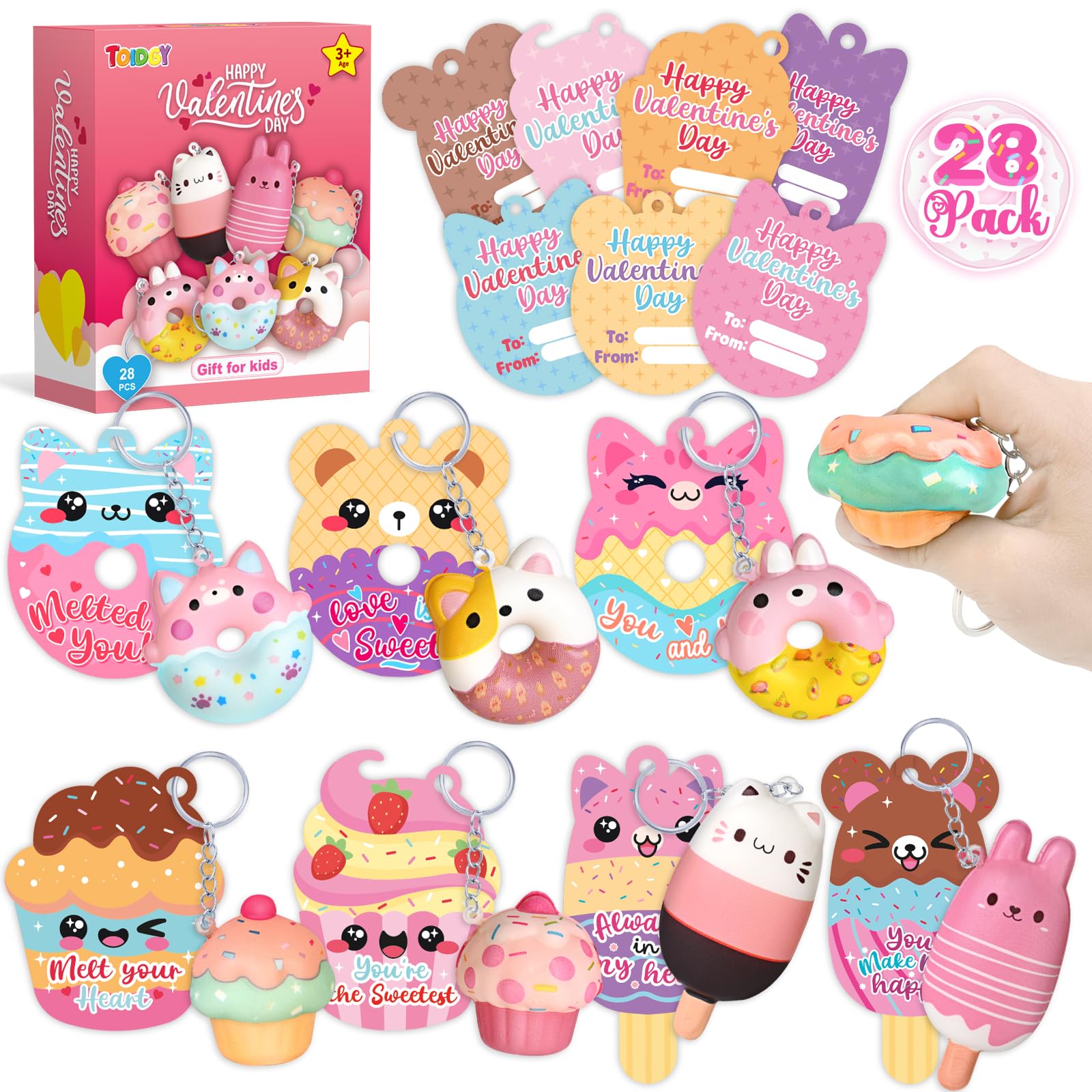 Toidgy 28 Pack Valentines Day Gifts for Kids, Valentines Cards for Kids Classroom Exchange Gift with Dessert Squishy Toys Keychains, Valentines Party Favors and Prizes for Boys Girls