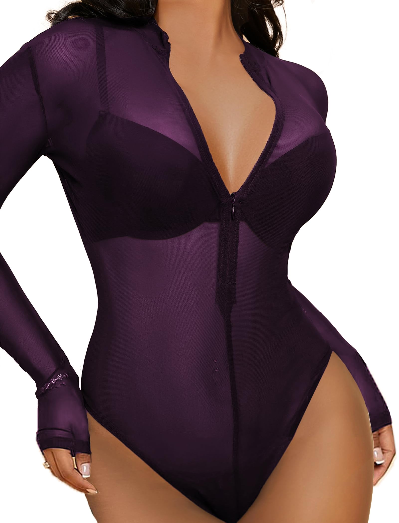 Avidlove Women's Mesh Bodysuit - Long Sleeve Snap Crotch See Through Zipper Sheer Leotard