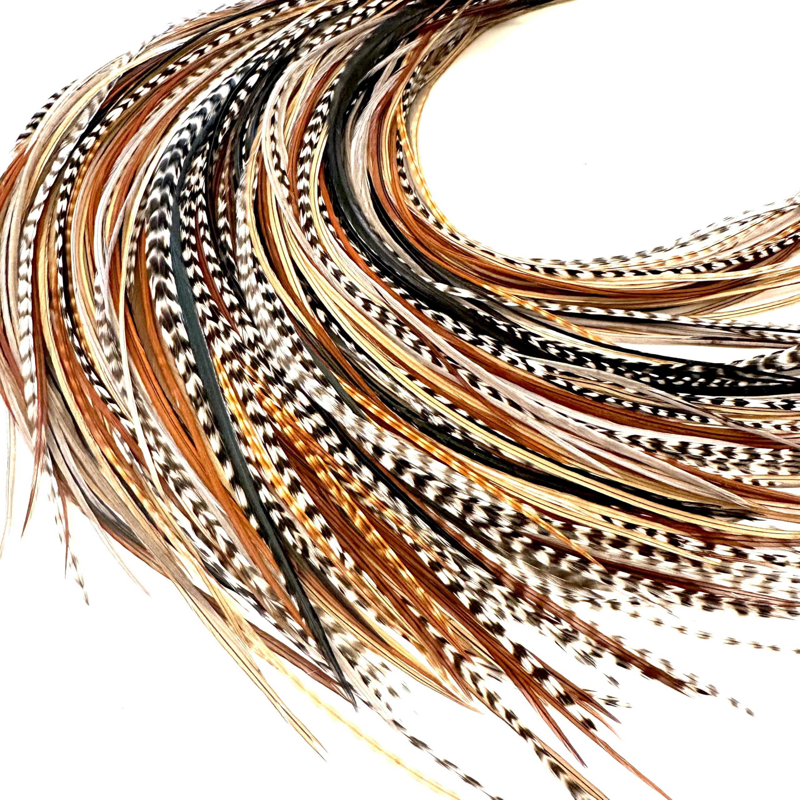 These feathers can be washed, styled, air dried, curled and even flat-ironed with your hair (withstanding heat up to 400°). Real authentic genuine rooster feathers. This package will include 21 Natural Color individual feathers, 20 micro link beads for attaching, Hair threader and installation instructions.Salon Quality Feathers: 100% Real Rooster Feathers between 9” - 14” long. Feather hair extensions offer a unique way to add some spice to your look. Curl them, wear them up or straighten them out. You can treat your feathers in any way that you do with your natural hair, even wear them for just one night out. Tons of Styling Options: These feathers are 100% real authentic rooster feathers. All feathers vary in shape, size, slight color variations making each package unique. Our feather hair extensions are long and thin. Feather hair extensions are crimped into the hair with a micro link extension bead and can be removed anytime with no damage to your hair. Soft & Comfortable Material: Feathers can be washed & curled. Includes hair threader & 20 micro link extension beads in kit. 21 Individual feathers for hair extensions. Feathers attach like hair extensions but are non-damaging & can easily add color to your hairstyle. If you would like to shorten them, cut from the top, not the ends, to make them look natural & not to alter the shape of the ends of the feathers. Features:21 feathers 20 micro link hair extension beads for attaching Hair threader Installation instructions For wavy, curly, or straight hair Withstanding heat up to 400° Gorgeous Real Feathers: 21 Natural Color feather hair extensions. 100% Real genuine rooster feathers you can curl, flat iron and blow-dry. These are real, skinny feathers hair extensions. A gorgeous way to spice up your hairstyle. 9”–14” Natural Color Hair Feathers: Real rooster feather extensions in natural shades. Once they grow out, simply remove and reapply to your hair. Perfect for adding flair and style to any look. Stylish & Fashionable: These high-quality feather hair extensions feature beautiful, vibrant colors that add a bold, boho flair to your hair. Easy to install, tangle-free, and shedding-free, they're perfect for girls, kids, and all genders. With proper care, they’ll give you a fresh, fashionable style that lasts for months. Premium Quality: These real rooster feathers are salon-grade—washable, air-dryable, and heat-styling safe (up to 400°F). They can be curled, flat-ironed, or styled just like your natural hair. With proper care, they can last for years. Proudly made in the USA: A USA made product, woman-owned small business that believes in quality, creativity, and confidence.