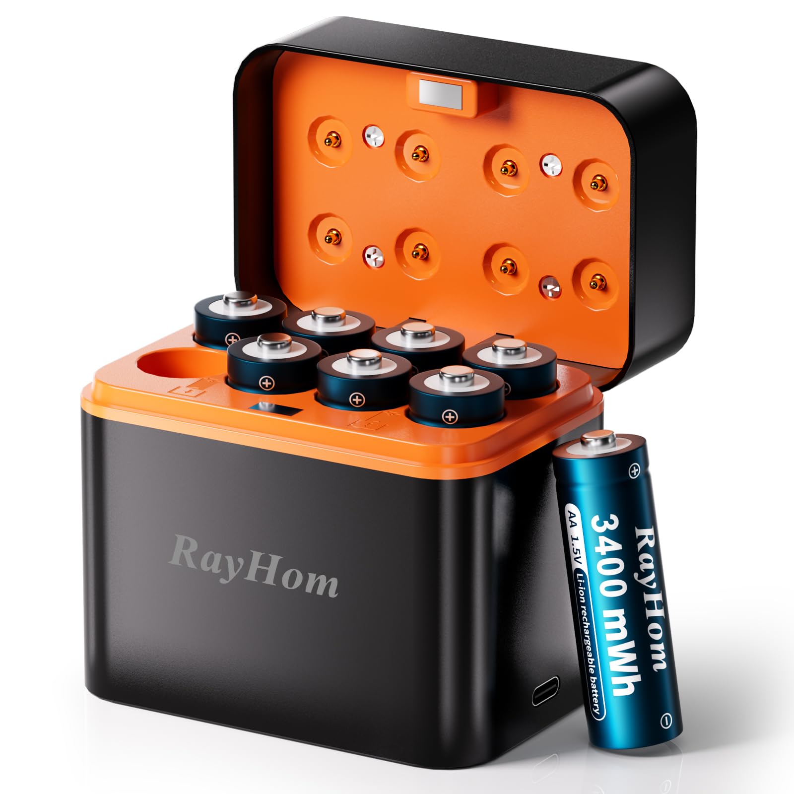 【Complete Charging System】Including 12x3400mWh high-capacity rechargeable AA batteries and an advanced 12-slot lithium battery charger. Each charging solt operates independently, allowing flexible charging from 1 to 12 batteries simultaneously with smart △V cutoff technology. 【Universal Compatibility】Professional-grade AA lithium battery charger works with all 1.5V rechargeable double A lithium batteries from any brand. Features automatic detection to reject non-rechargeable/damaged cells (red LED alert) and over-temperature protection (green LED flash warning). 【Rapid & Safe Charging】Equipped with MCU-controlled 350mA pulse charging current and auto-switch to trickle mode. USB-C powered charger delivers 5V stable output, completing AA batteries charging 30% faster than standard chargers while preventing overcharging/overheating. 【Smart Storage Solution】Magnetic-sealed charging station with full-wrap design protects your rechargeable AA batteries from dust, moisture, and dirt when not in use. Compact footprint for perfect home/office battery organization. 【LED Indicator 】USB-C AA battery charger with LED status indicators (charging-red/fully charged-green). Ideal for high-drain devices like game controllers, flashlights, and digital cameras. Includes 1 year warranty. 【Excellent after-sales service】RayHom has high-quality and perfect after-sales service, if you have any problems with the product you received, please contact us immediately, we will try our best to help you solve it.
