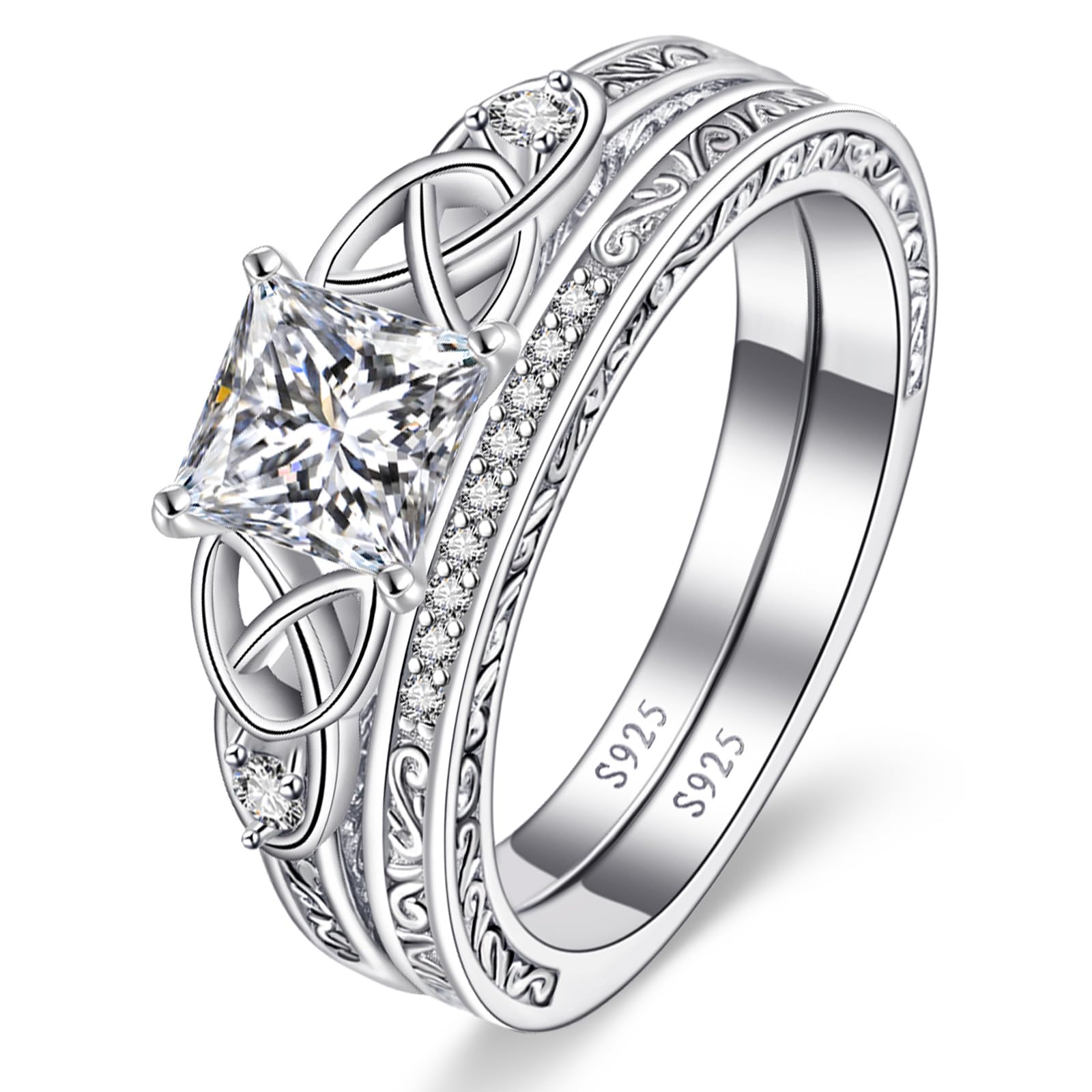 【High-Quality】5A Grade Cubic Zirconia 925 Sterling Silver Engagement Ring. Crafted from premium 925 Sterling Silver and rhodium plated for enduring brilliance. Elevate your love story with our Celtic Knot Engagement Ring Set, This symbol of eternal love is designed to captivate hearts and stand the test of time. 【Dazzling Focal Point】The centerpiece features a brilliant 6mm princess cut Cubic Zirconia, meticulously set in a secure prong setting. Its radiant sparkle mimics the beauty of genuine diamonds, ensuring all eyes are on you as you embark on this romantic journey together. 【Delicate Band Details】The main ring band boasts a slender width of 1.8mm, providing a delicate and feminine touch. Complemented by an equally refined 1.8mm width on the secondary band, this set exudes sophistication and modern charm. 【Occasion】 The sterling silver statement stackable ring allows you to easily match it with the Solitaire ring. The everlasting wedding ring band is surprincessed by a hand-carved celtic knot to keep your love connected for a long time. The perfect gift idea for your wife, mother, girlfriend,or yourself. Valentine's Day, Weddings, anniversaries, engagements, Mother's day, birthday parties, and other everyday occasions. 【Service】 You will receive beautiful jewelry bags, and rings. This is the best gift for you and yourself. If there are any quality problems or you are not satisfied, please feel free to contact us. We will serve you wholeheartedly!