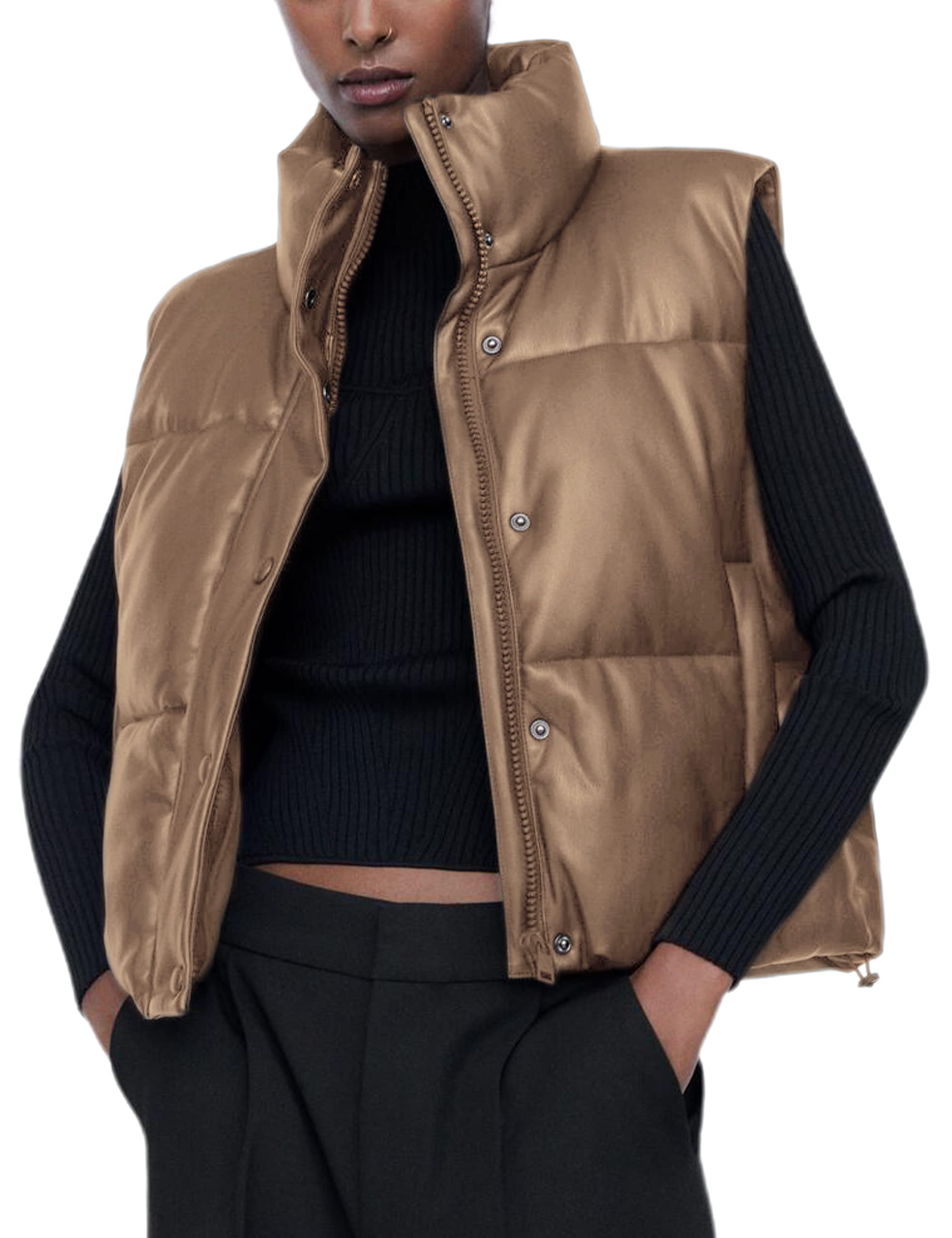 【Material】The puffer vest women is made of leather fabric which helps to keep out the wind and chill in the cold winter, and the leather vest is warm and comfy to wear 【Features】Ailoqing womens faux leather puffer vest with two side pockets, stand collar, snap and zipper closure, hem with adjustable drawstrings, faux leather vest 【Occasions】Black puffer vest women is the perfect addition to your winter wardrobe, sleeveless puffy vest jacket coat outerwear is suitable for traveling, hiking, outdoor activities and casual wear 【Match】Leather vest women it's super cute, and compliments a variety of outfits, such as sweaters, shirts, jeans, leggings, and sneakers to create different styles! 【Warm Tips】This leather puffer vest is vacuum packed, please pat, steam or hang to dry for easy wrinkle removal and puff it again. White puffer vest for women/Black vest women puffer/Brown puffer vest/Green puffer vest