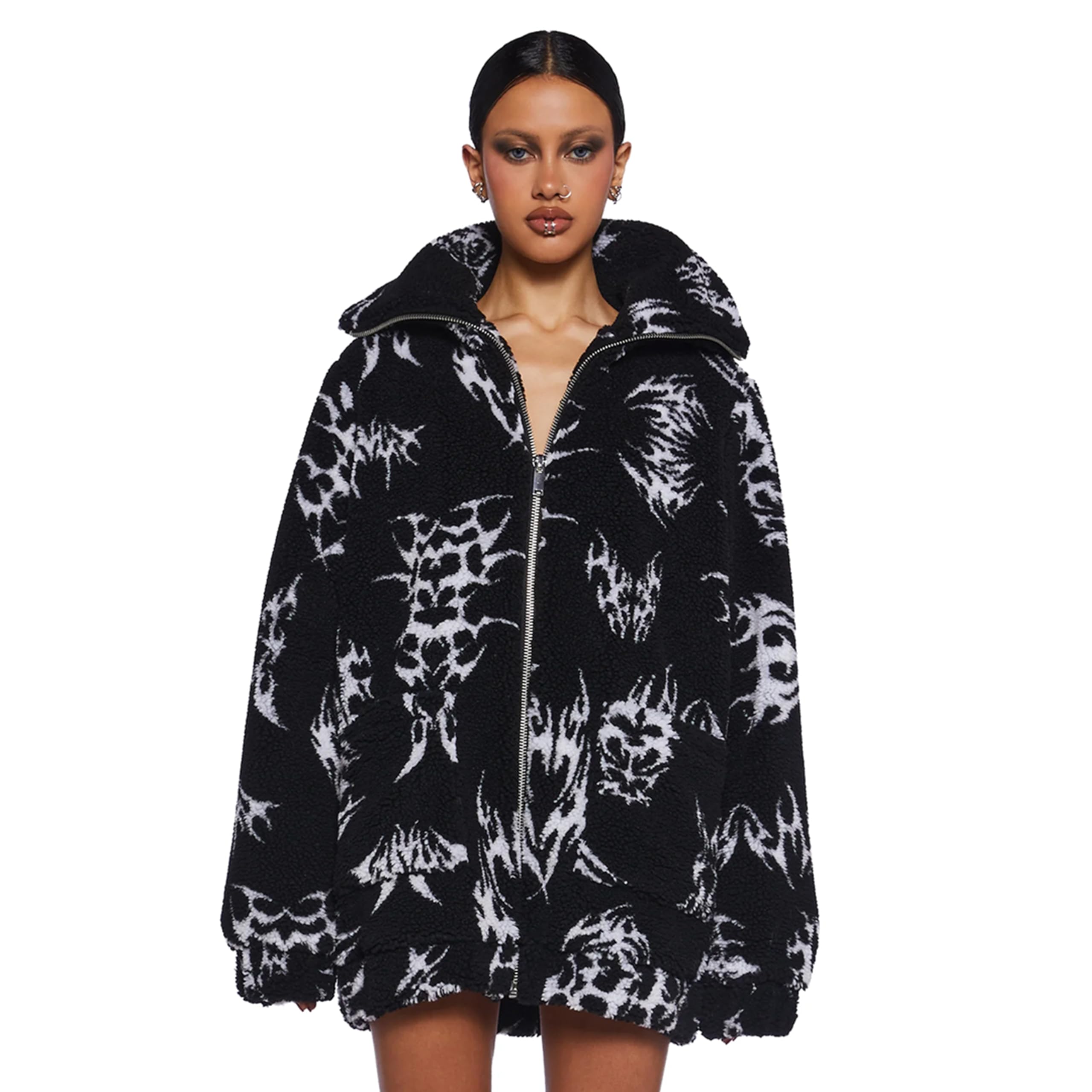 Step up your cold-weather style with the Dolls Kill Ciphered Up Sherpa Jacket. Made from cozy faux shearling, this jacket is as warm as it is bold. The all-over symbol print adds an edgy touch, while the oversized fit ensures a relaxed, comfortable wear. This jacket blends style with practicality and features functional front pockets and a convenient zipper closure. Perfect for layering over your favorite outfits, it's the ultimate piece for staying warm and making a statement. Soft Faux Shearling Material: Experience ultimate coziness with this jacket's luxurious faux shearling material, perfect for chilly days. Unique Symbol Print Design: Features an all-over symbol print for an edgy and distinctive look that sets you apart. Functional Front Pockets: Equipped with front pockets to keep your hands warm or store small essentials on the go. Oversized Fit for Extra Comfort: Enjoy a relaxed, oversized fit that provides maximum comfort while maintaining a trendy silhouette. Unleash Your Attitude: We are the back of the class, and front of the club. Misfits who are not alone, giving you the power to fearlessly express yourself with original fashion and endless unique looks.