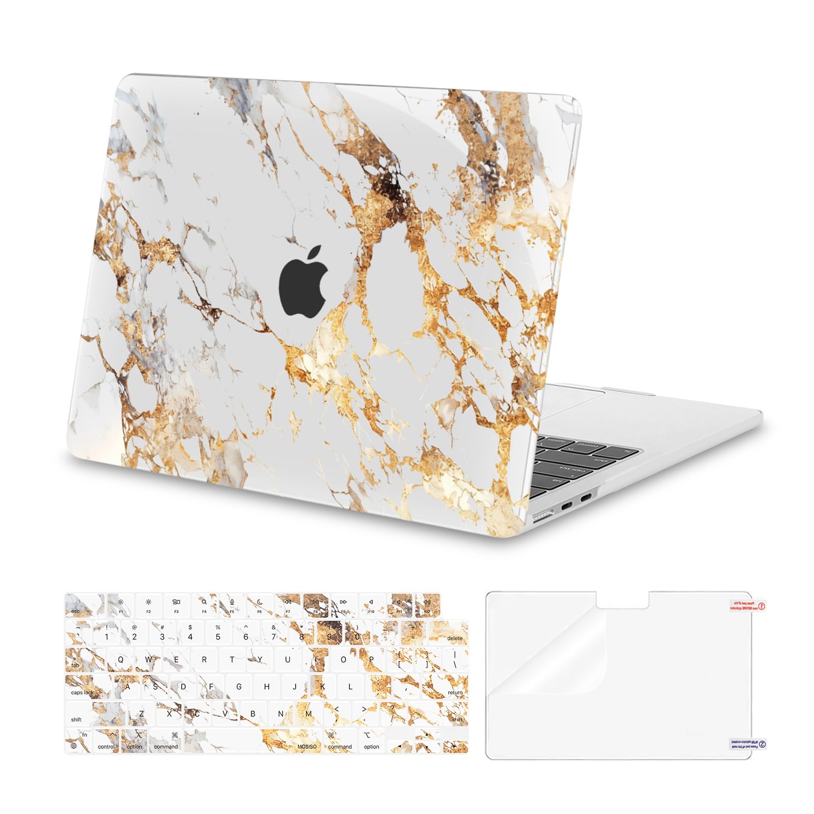 Including 1 protective plastic hard shell case cover (compatible with MacBook Air 13 inch case 2025, compatible with MacBook Air 13 inch case 2024, compatible with MacBook Air 13 inch case 2023 and compatible with MacBook Air 13 inch case 2022) & 1 keyboard cover & 1 screen protector to protect your keyboard & screen against spills. Friendly Note: Please kindly check the model number "Axxxx" on the back of the laptop before your purchase. Make sure you choose the exact same model number as the listing title stated "A3240" or "A3113" or "A2681" that compatible with MacBook Air M2 case & compatible with MacBook Air M3 case & compatible with MacBook Air M4 case & compatible with MacBook Air 13 inch case A2681 & compatible with MacBook Air 13 inch case A3113 and compatible with MacBook Air 13 inch case A3240. Designed ONLY to be compatible with MacBook Air 13 inch case M4 M3 M2 2025 2024 2023 2022 Release with Liquid Retina Display & Touch ID (models: A3240 & A3113 & A2681 - MC6T4LL/A, MW123LL/A, MW0W3LL/A, MW0Y3LL/A, MW103LL/A, MW0X3LL/A, MW133LL/A, MC6U4LL/A, MC6V4LL/A, MC6C4LL/A, MC654LL/A, MC6A4LL/A, MRXV3LL/A, MRXQ3LL/A, MRXN3LL/A, MRXT3LL/A, MXCV3LL/A, MXCT3LL/A, MXCR3LL/A, MXCU3LL/A, MLXW3LL/A, MLXX3LL/A, MLXY3LL/A, MLY03LL/A, MLY13LL/A, MLY23LL/A, MLY33LL/A, MLY43LL/A). WARNING: This case is NOT compatible with other model laptops. Please kindly check the model number "Axxxx" on the back of the laptop before purchase, make sure you choose the exact same model number as the listing title stated "A3240" or "A3113" or "A2681" that be compatible with MacBook Air M4 13 inch case & compatible with MacBook Air M3 13 inch case and compatible with MacBook Air M2 13 inch case. NO Cut Out design. Fully vented for heat disbursement, fully access to all buttons and features. Totally removable, easy to put on and take off that can protect your laptop from scrapes and scratches. Artistic gold marble case dimension: 12 x 8.5 x 0.46 inch, compatible with MacBook Air M2 case 13 inch, compatible with MacBook Air M3 case 13 inch, compatible with MacBook Air M4 case 13 inch with liquid retina display & Touch ID with dimension: 11.97 x 8.46 x 0.44 inch (2022 2023 2024 2025 Released). Including keyboard cover & screen protector to protect your keyboard & screen against spills.
