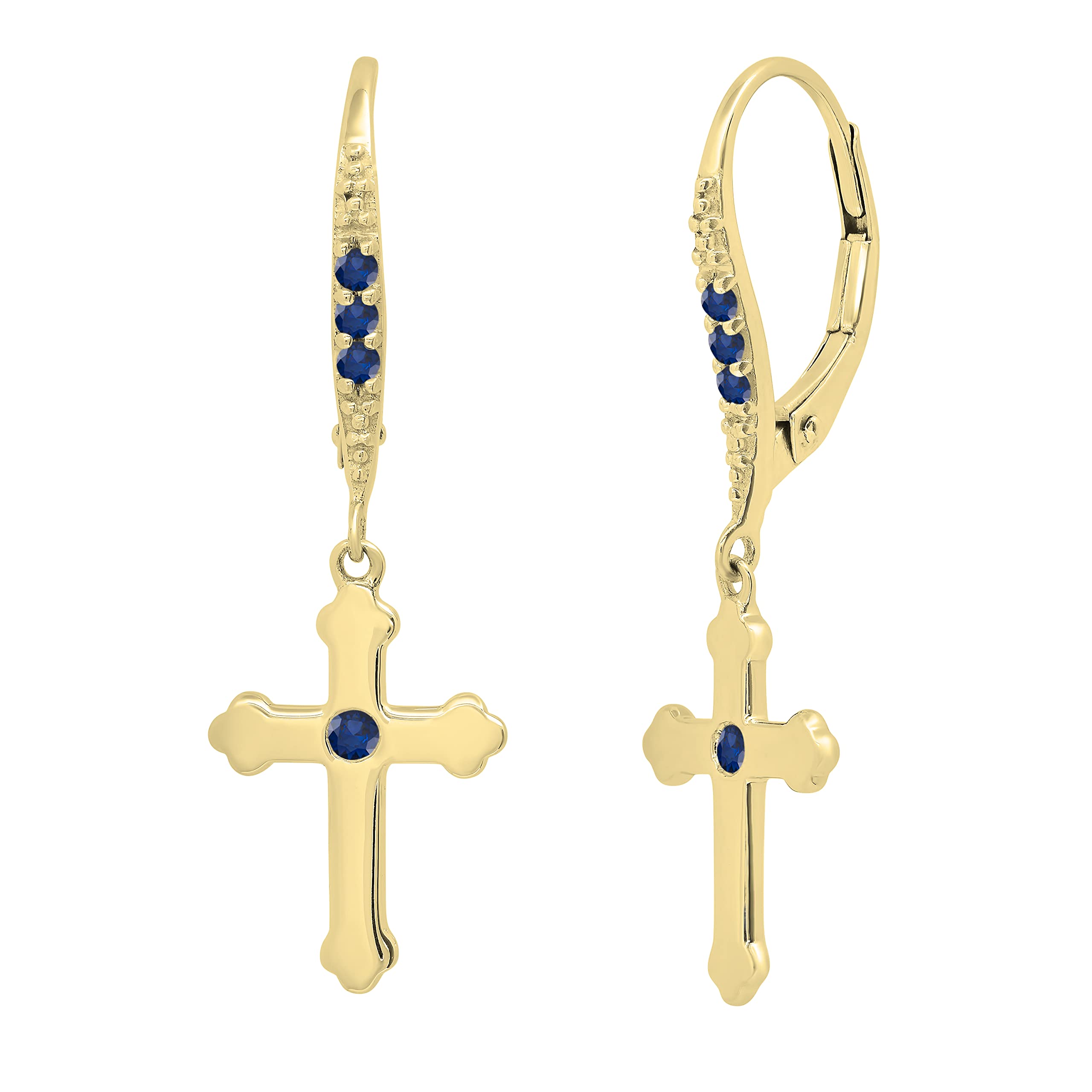 Dazzlingrock Collection Round Gemstone or Natural Diamond Cross Drop Lever Back Men's & Women's (Unisex) Earrings in Real Solid Gold: Blue Sapphire 14K Yellow Gold