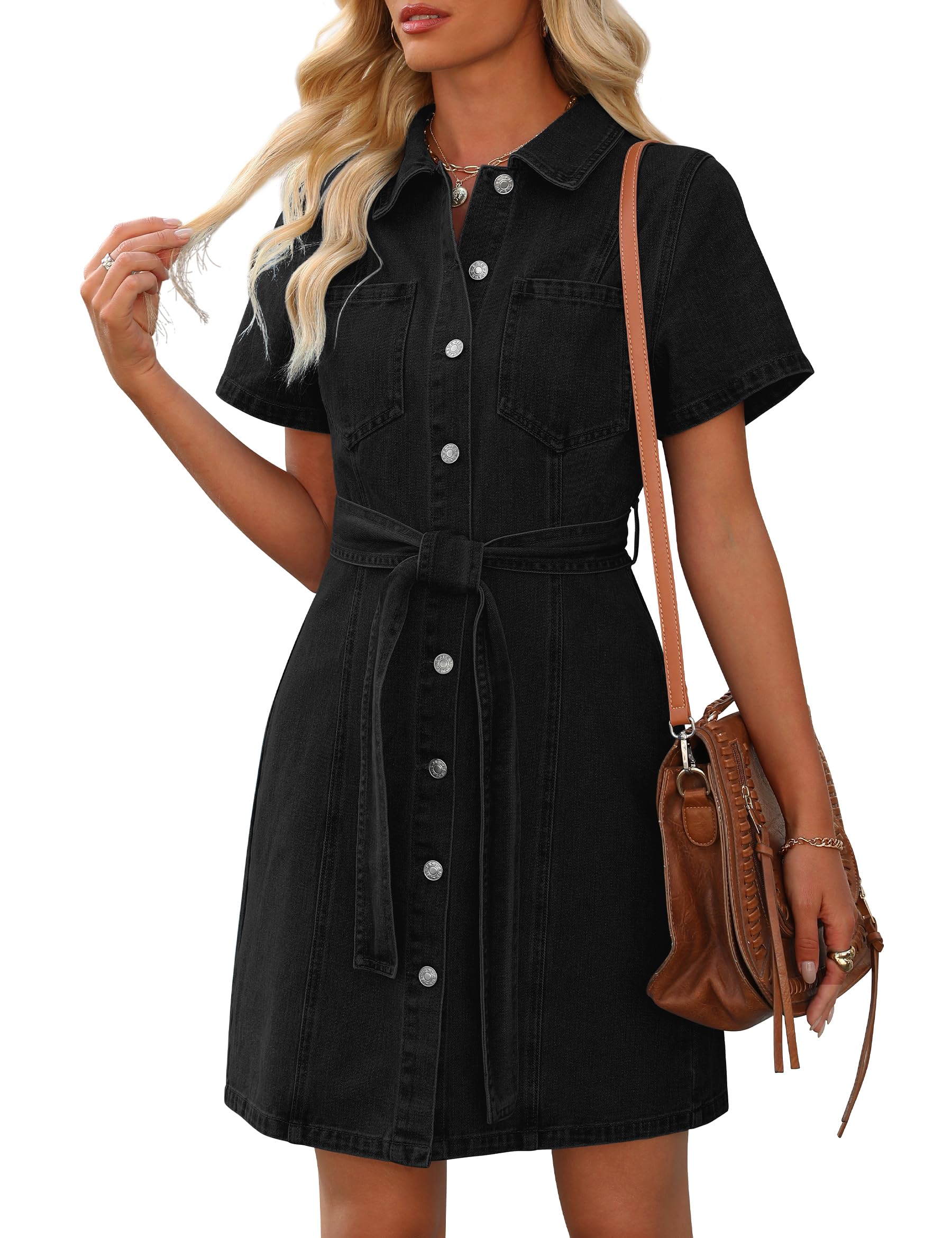 Women short sleeve button down dreawtring wasit denim jean dress with two front pockets,with belt,strethy fabric soft skin friendly denim fabric.keep you trendy in the casual summer day. Features:This summer Denim Dress Summer Crafted from a luxe 80% cotton blend with 18% polyester durability and 2% stretch-enhancing spandex,this denim shirt dress redefines everyday comfort. The breathable, four-way stretch fabric contours to your curves while resisting wrinkles.A must-have casual and trendy jean dress in your wardrobe Design:Summer short sleeve button down denim shirt babydoll dress,two front pocket,Summer's ultimate staple combines fashion and utility: a relaxed short-sleeve silhouette features drawstring waist tailoring to toggle between hourglass shaping or loose boyfriend-fit styles,give you more wearing experience Occasions: Western Denim shirt dress above knee length is suitable for most events like casual daily wear,going out,home,party,wedding guest,street,holiday,vacation,shopping,beach wear in spring, summer, fall and winter. Match Tips:This jean dress is definitely ideal to pair with leggings or directly with sneakers,sandals,high heels or boots for a stylish looking Nitzana women western denim shirt dress runs true to US sizes. Size X-Small fits size 0 - size 2, size Small fits size 4 - size 6, size Medium fits size 8 - size 10, size Large fits size 12 - size 14, size X-Large fits size 16 - size 18