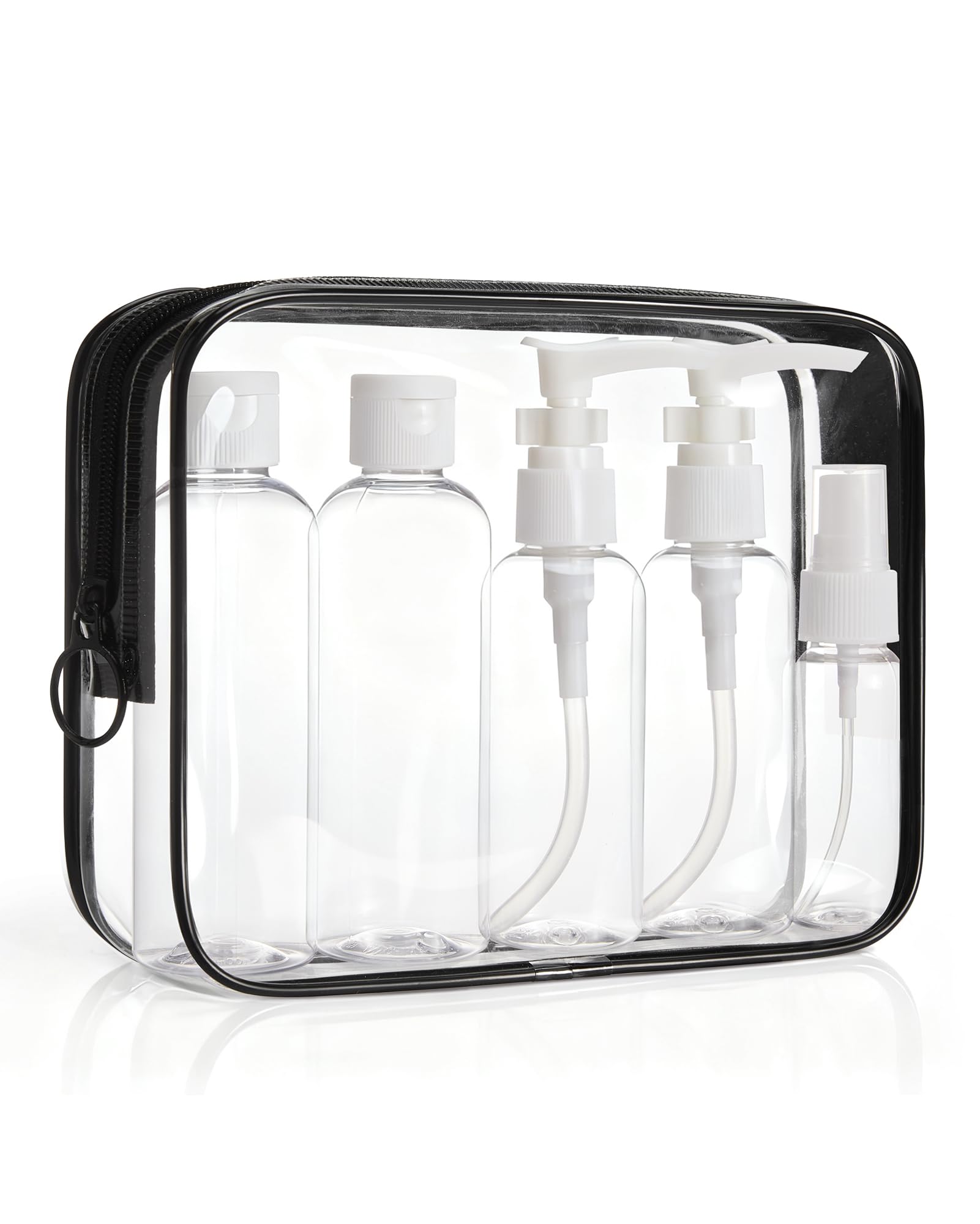 BAGSMART Clear Toiletry Bag, 2 Pack TSA Approved Travel Toiletry Bag Carry on Travel Accessories Bag Airport Airline Quart Size Bags Water Repellent Makeup Cosmetic Bag for Women (Black-2pcs): 1 Pack with 5 bottles, Medium Pure Black