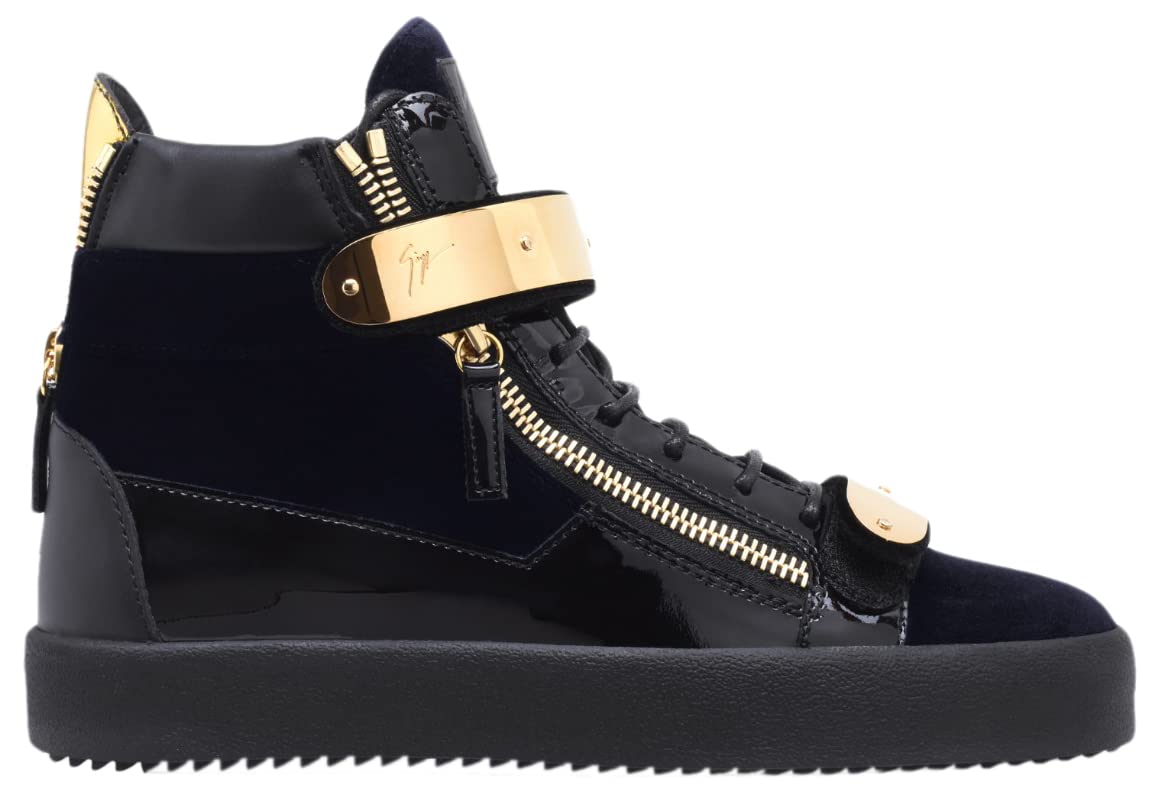 Mid-top sneakers crafted from black patent leather, featuring golden side zipper fastening, two golden metal Velcro straps with logo and a 'Signature' detail on the tongue; a black rubber sole gives the design a perfect finish. Outer: 100% Leather; Sole: 100% Rubber; Lining: 100% Fabric Imported Blue velvet and black patent leather Black cotton laces Golden metal straps with logo