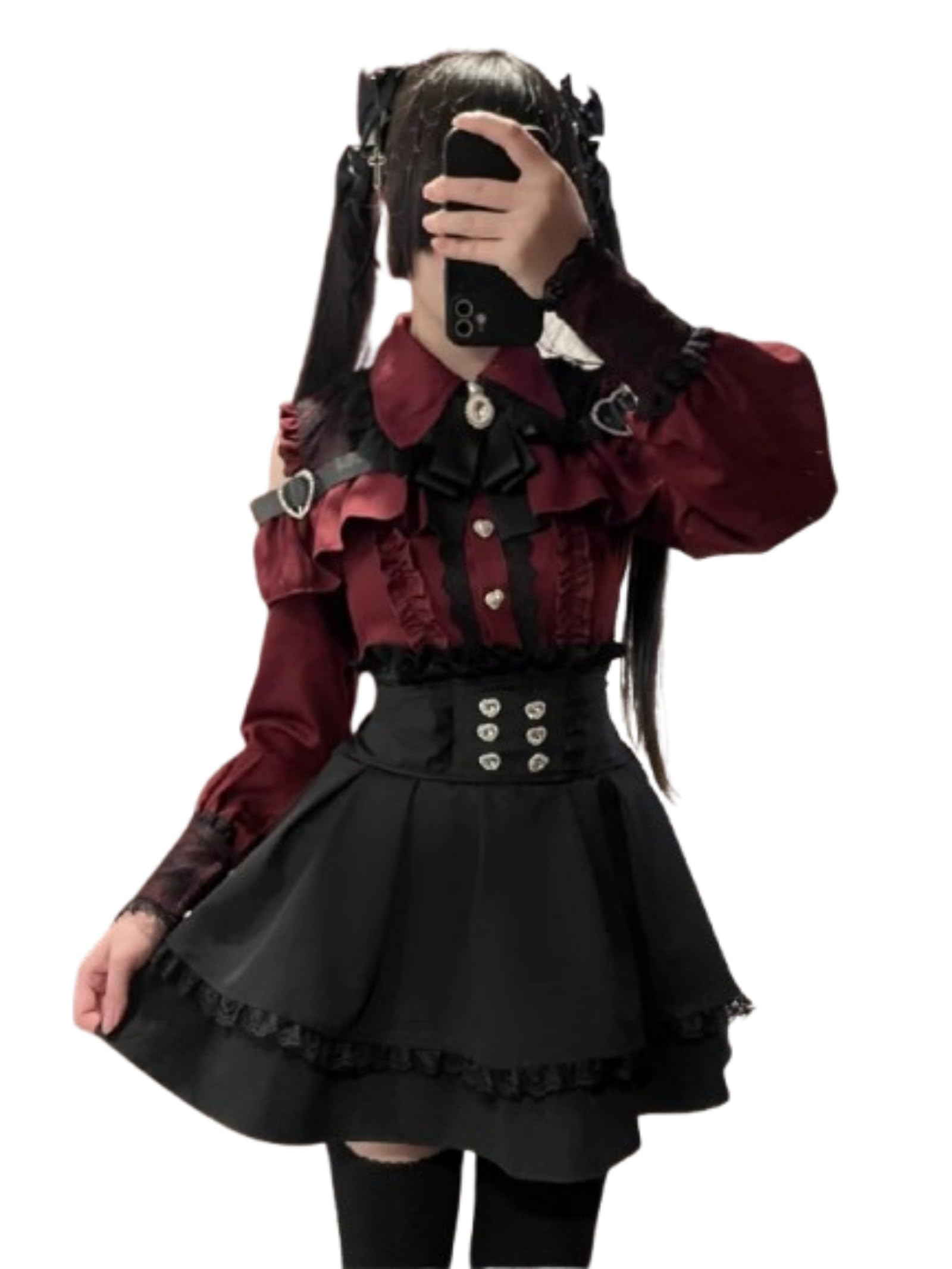 Wayolyn Lolita Shirts Jirai Kei Fashion Kawaii Clothing Goth Shirts Women Lace Mesh Sheer Long Sleeve Blouse: Red X-Large