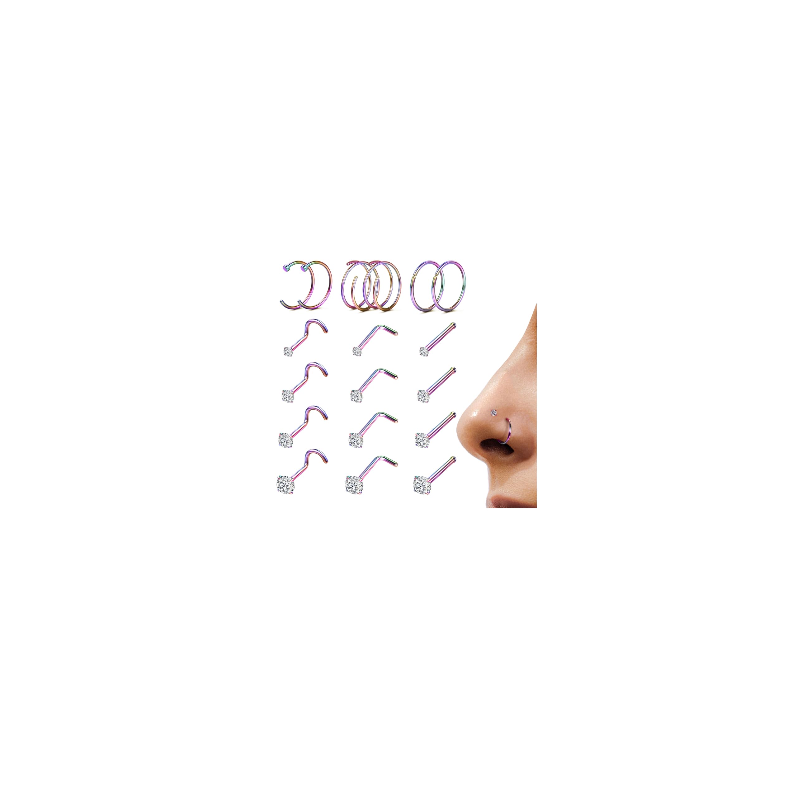 LOYALLOOK 18Pcs Nose Rings Studs 316L Surgical Steel Silver Nose Studs Double Hoop Nose Ring for Women Men 18G Silver Nose Rings Stud Hypoallergenic Nose/Body Piercing Jewelry 1.5mm 2mm 2.5mm 3mm CZ NOSE RING SET: Package includes 18 pcs cute nose rings hoops in a velvet bag: 12pcs nose rings studs: (4 pcs l shaped nose rings; 4 pcs screw nose stud and 4 pcs straight nose studs) ; 6pcs nose hoops: (4pcs classic nose hoops and 2 pcs spiral double nose hoops). More choices for daily wearing. PREMIUM QUALITY: These hypoallergenic nose ring pack are made of 316L surgical steel and sparkling 5A cz. Lead free, nickel free and cadmium free, resist rust and resist corrode; High polished smooth surface, do not scratch your skin. LONG LASTING SHINE: All colors of nostril piercing jewelry are expertly electroplated to ensuring they maintain shine over time. Each is delicate, beautiful and sparkling. Perfectly suitable for long term comfortable wear. GAUGE SIZE: Small nose jewelry gauge size: 18G=(1mm). Hoop nose ring inner diameter: 8mm, straight screw L shaped nose studs post length: 7mm, cz stud size: 1.5mm, 2mm, 2.5mm, 3mm. All shape nose rings studs is easy to put on and take off, suitable for women and men. IDEAL GIFT: Our siver nose rings hoop are exquisite and good quality, come with a high quality VELVET GIFT BAG. Priorizing your skin's safety. A perfect gift to your friends, lovers on Birthday, Christmas Day, Anniversary Day, Valentine's Day and more. MULTIPLE USING: LOYALLOOK body piercing jewelry can be as nose ring, lip rings, septum rings, earring hoops, tragus helix conch piercing jewelry for women. Nose jewelry for women are great for daily jewelry looks and party accessories.
