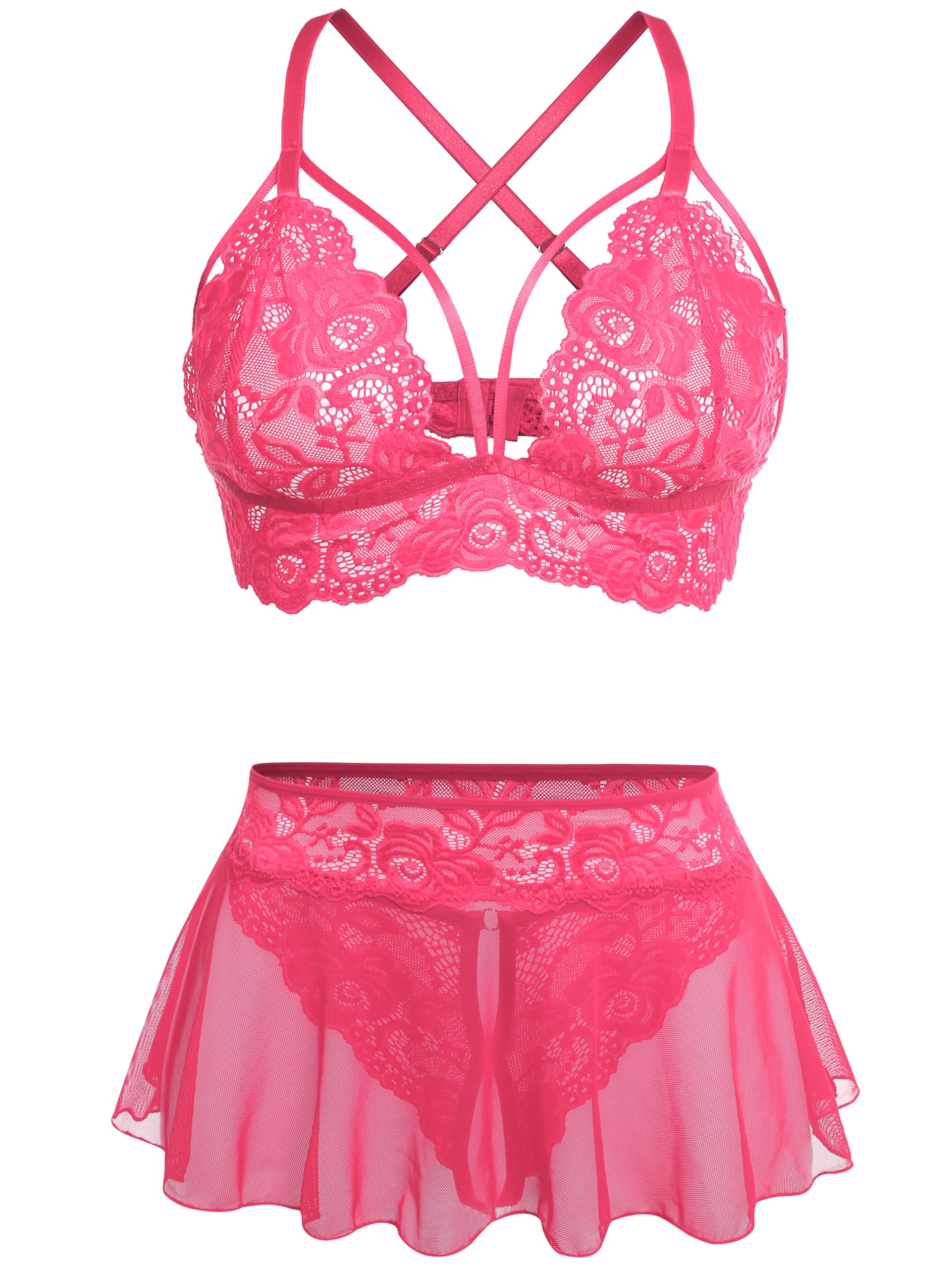 Feature: Sexy lingerie set features hollow out lace cups with strappy detail, adjustable spaghetti straps, a matching sexy lace mini skirt and a lace panty, spicing up your love Design: High waist Mini shirt matched high cut thong bottom will highlight your legs line. Hook & eye back closure and adjustable straps make it easy for wearing Style: This v neck 3pc lingerie set with soft lace bra can enhance femininity and outline sexy breast lines, making you more charming Occasion: Wonderful choice for Valentine's Day, honeymoon, wedding anniversary, bridal shower, dating night, Christmas, boudoir shoot, bachelorette party and every sweet night Fabric: Boudoir outfit is made of high quality lace fabric, lightweight and breathable material will bring you soft touch feeling, spicing up your life