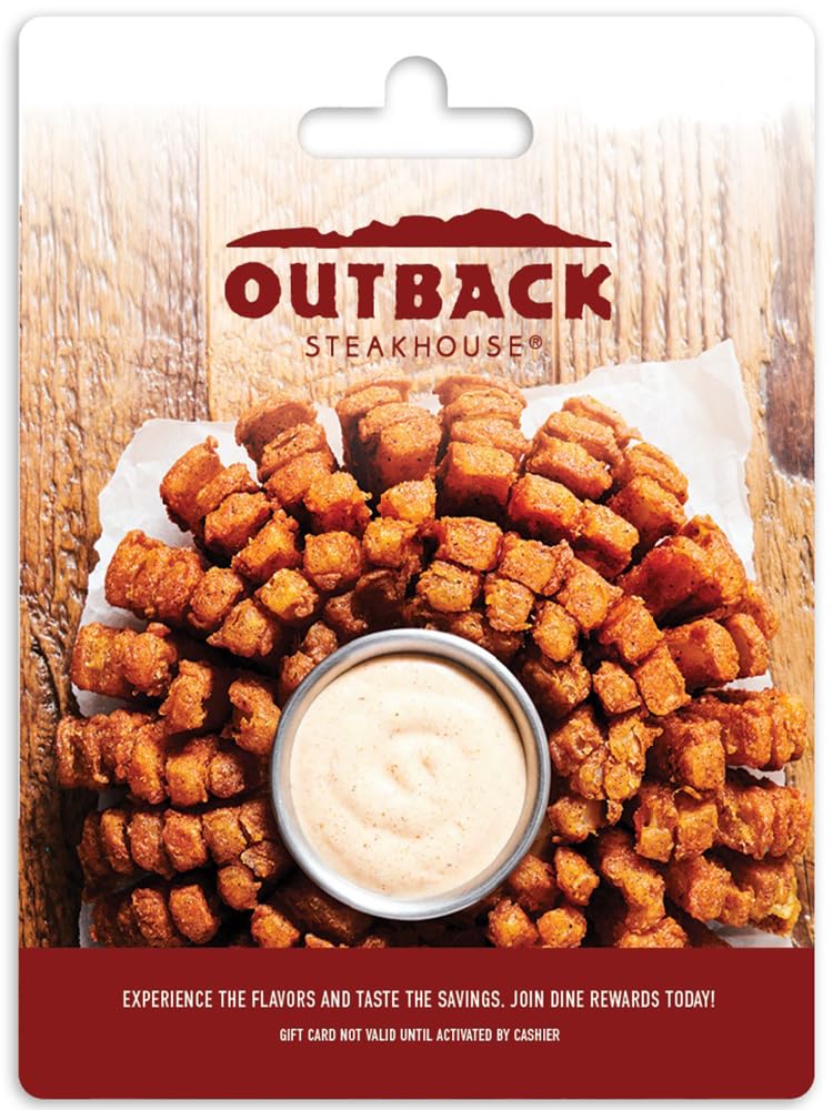 Looking for a unique gift idea, mate? We’ve got Outback Gift Cards for all of life’s “Yay” moments: Outback Steakhouse is known for our juicy, boldly seasoned steaks, but we’ve got something for every bloke, like our burgers, Alice Springs Chicken, Perfectly Grilled Salmon, pasta dishes and more. Casual, kid-friendly dining: No need to get fancy when you fancy a steak dinner. Outback Steakhouse Gift Cards go a long way when you take advantage of weekday deal days like Walkabout Wednesday, Tuesday Tails, and other limited-time offers Give the gift of boldly seasoned steak, our world-famous Bloomin’ Onion, and a night off from cooking and doing dishes Outback Gift Cards make aus-some Experience Gifts for any occasion — and for every bloke or sheila on your list Outback Steakhouse Gift Cards can be redeemed at 600+ Outback Steakhouse locations, plus Carrabba's Italian Grill, Bonefish Grill and Fleming's Prime Steakhouse & Wine Bar locations in the United States, Puerto Rico and Guam Outback Gift Cards can be redeemed In-Restaurant, Online / To-Go orders We invented the Bloomin’ Onion (need we say more?) Picky eaters? No problem. Even the pickiest joeys and grown-ups are sure to find a dish they love No returns and no refunds on Outback Gift Cards