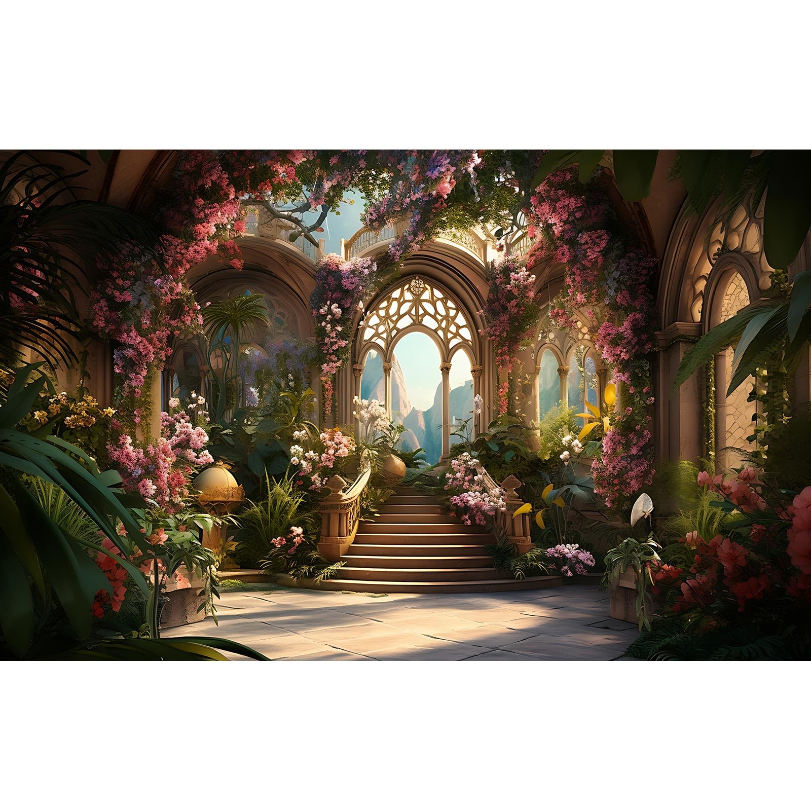 Garden Backdrop Wedding Archway Pink Flowers Photography Background Beautiful Fantasy Garden Scene with Stairway Backdrops Birthday Party Wedding Anniversary Portrait Photo Studio Props: 12x8ft