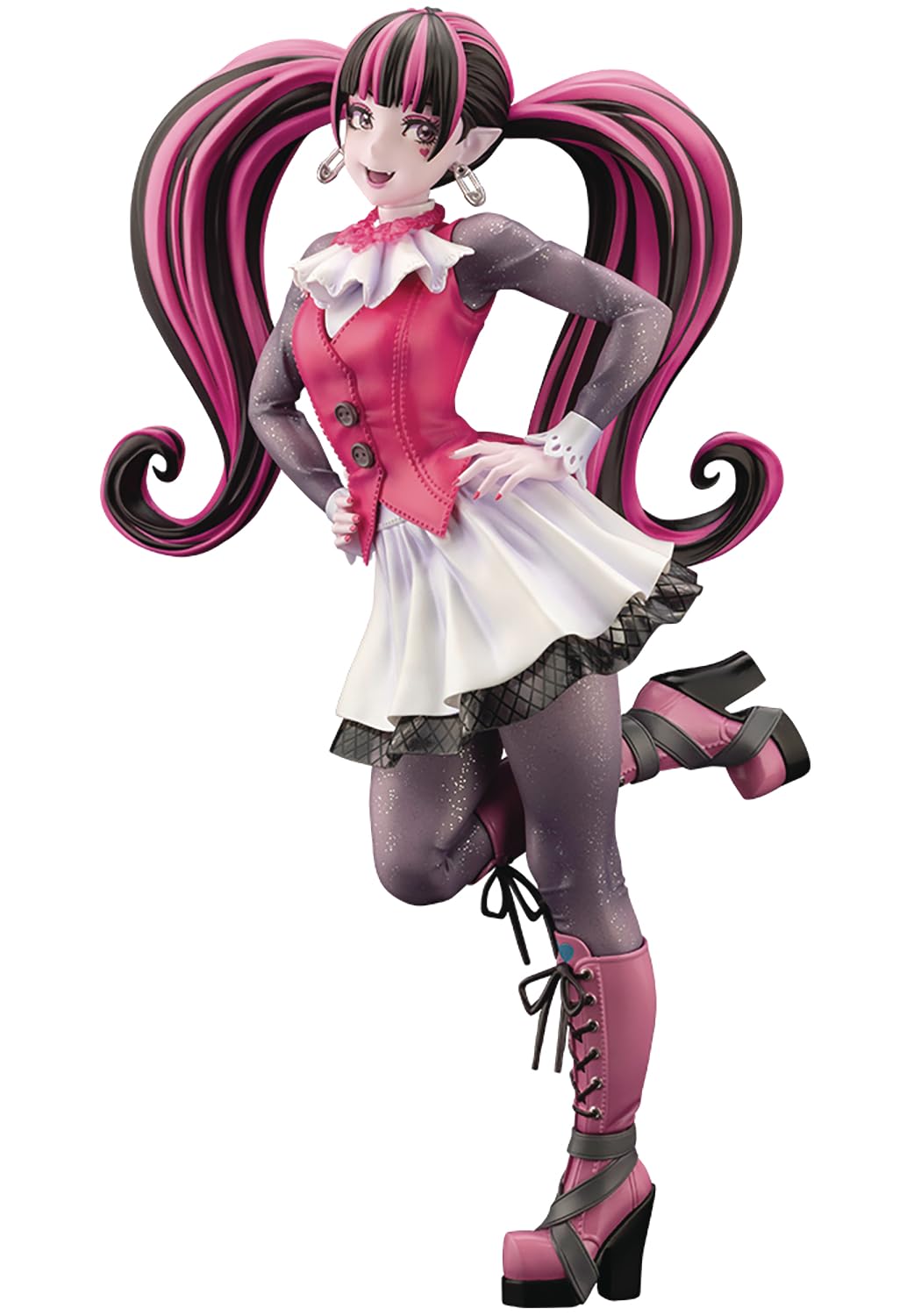 From Kotobukiya. Mattel's doll series MONSTER HIGH™ has been full of fashion and individuality since its release in 2010 with the empowering message of "Be Yourself. Be Unique. Be a Monster." Now, from the beloved lineup of Ghouls comes Draculaura™, the bright and playful daughter of Dracula™! Based on an original illustration by renowned artist Shunya Yamashita, Draculaura™ makes her fangtastic BISHOUJO debut. Her iconic pink and black hair is sculpted with incredible detail, making her stand out from every angle. True to the MONSTER HIGH™ spirit, her outfit is carefully crafted with attention to fabric textures, folds, and details, right down to the sparkling glitter finish on her ultra-cool tights. Why blend in when you can stand out? Don't miss this unique, stylish take on Draculaura™ in this new MONSTER HIGH™ BISHOUJO figure! A Kotobukiya Japanese import From Mattel’s popular doll series Based on an original illustration by renowned artist Shunya Yamashita Carefully crafted outfit with attention to fabric textures, folds, and details, right down to the sparkling glitter finish on her ultra-cool tights