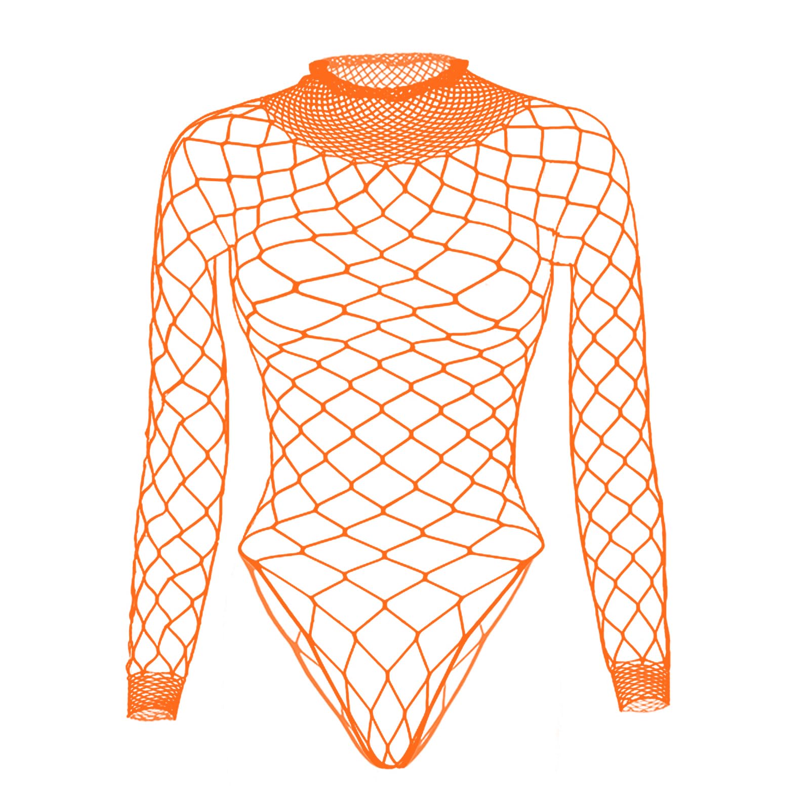 Tosmifairy Fishnet Bodysuit Top for Women Stretch One Piece Long Sleeve Mesh Rave Romper Body Suit: Fluorescent Orange