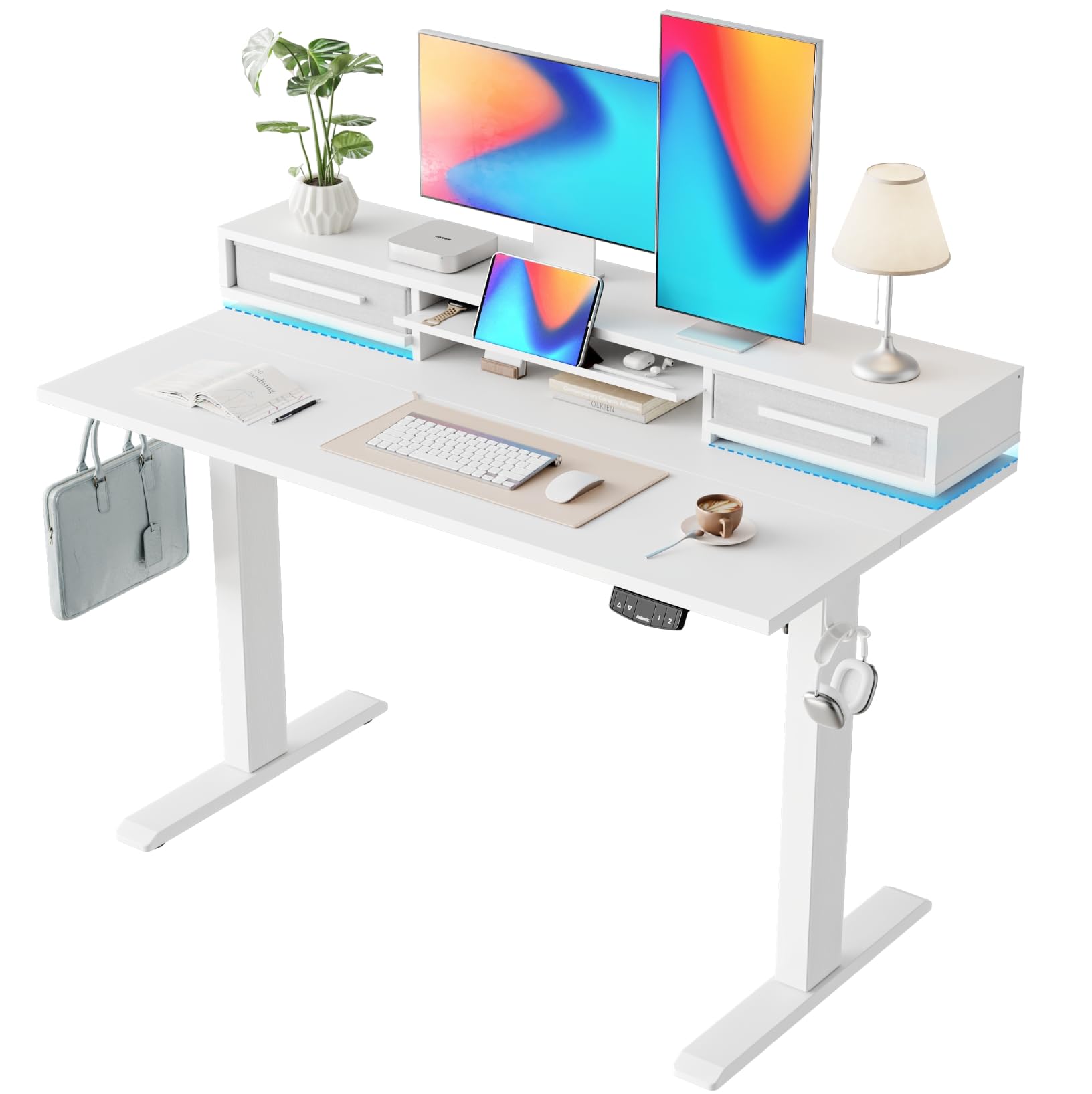 Agilestic Glass Standing Desk with Storage, 48 Inch Electric Adjustable Desk with Glass Shelf and Cable Management, Sit Stand Up Home Office Computer Table, Splice Board, White: White 48 x 24 Inches with 2 drawers