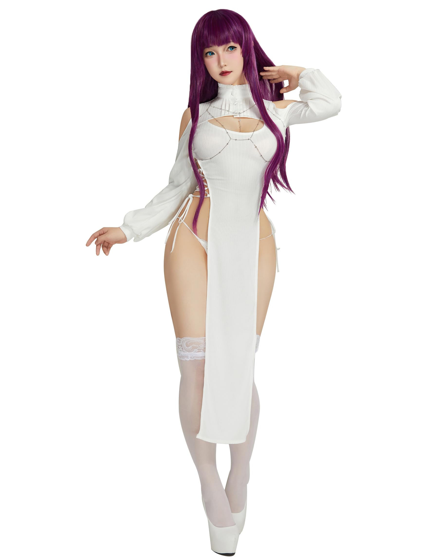 Mobbunny Women's Anime Cosplay Dress Cutout High Slit Dress and Thong with Stockings Chest Chain