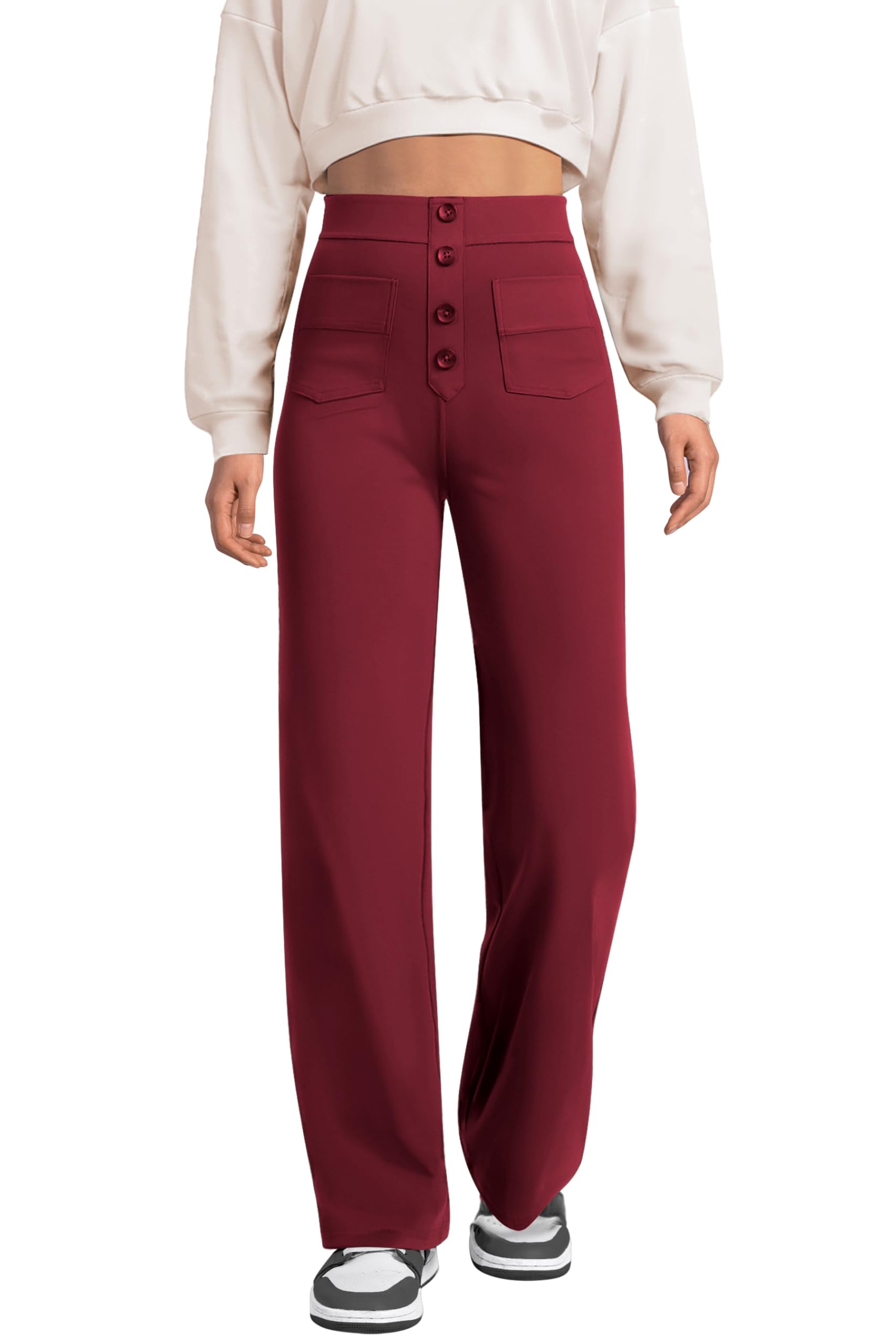 LIGHTWEIGHT STRETCHY FABRIC-FREELY & COMFORTABLE: Women's straight wide leg pants are made of 80% Polyester + 20% Spandex. Lightweight,buttery soft, breathable fabric made for both indoor and outdoor activities. Four-way stretch fabric offers ease of movement and durable wearability HIGH WAISTED STRAIGHT WIDE LEG DESIGN -SLIM-LOOKING ELONGATED FIGURE: High waist,streamlined hips cutting and loose straight wide leg design helps contribute a streamlined look and shows the beauty of the body, which leads to more confidence when worn for business or casual activities NON-FUNCTIONAL BUTTONS & MULTIPLE POCKETS-AESTHETIC & FUNCTIONAL: Buttons aren't just for function, they can be cute too! These pants are designed with stylish button placement that adds a touch of charm. And with multiple pockets, you can easily store your cards or other small items CASUAL DAILY WALKING WORK - MULTIPLE OCCASIONS: Worried about ideal pants for fitness or work? Now, you can spend the workday comfortably in clothes designed for busy working women. The fabric of yoga pants and the design of work pants come together to fulfill your desires for yoga, leisure, and work WARM TIPS: Hand wash or machine wash in a low temperature. The model display is for style reference only. Please refer to the size chart before purchasing