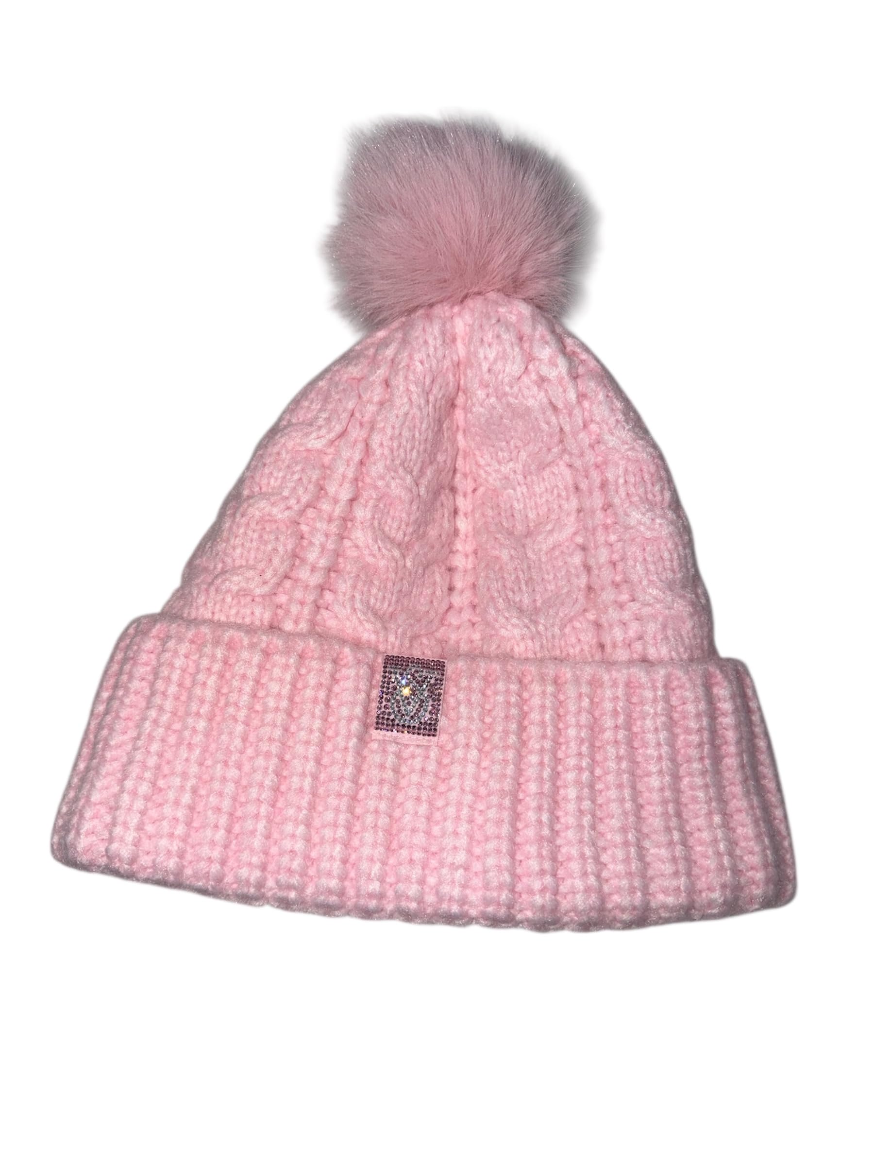 Victoria's Secret Cozy Cable-Knit Pom Beanie Shine Color Pink Rhinestone Logo New