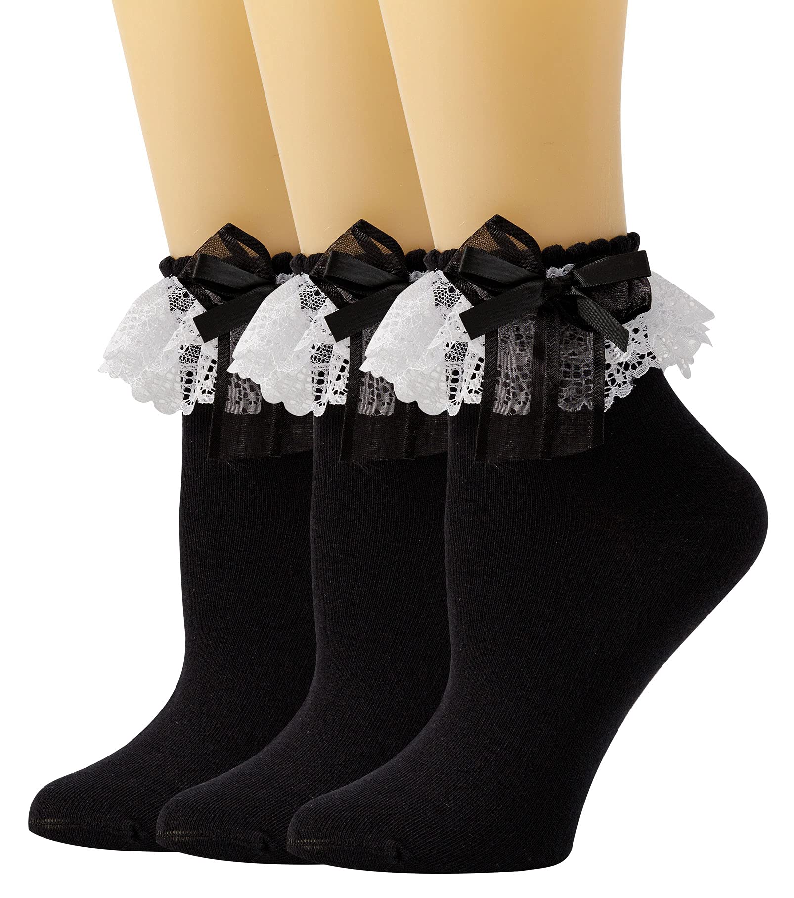 SEMOHOLLI Women Ankle Socks, Lace Ruffle Frilly Comfortable Princess Socks: 5-8 3 Pairs-black