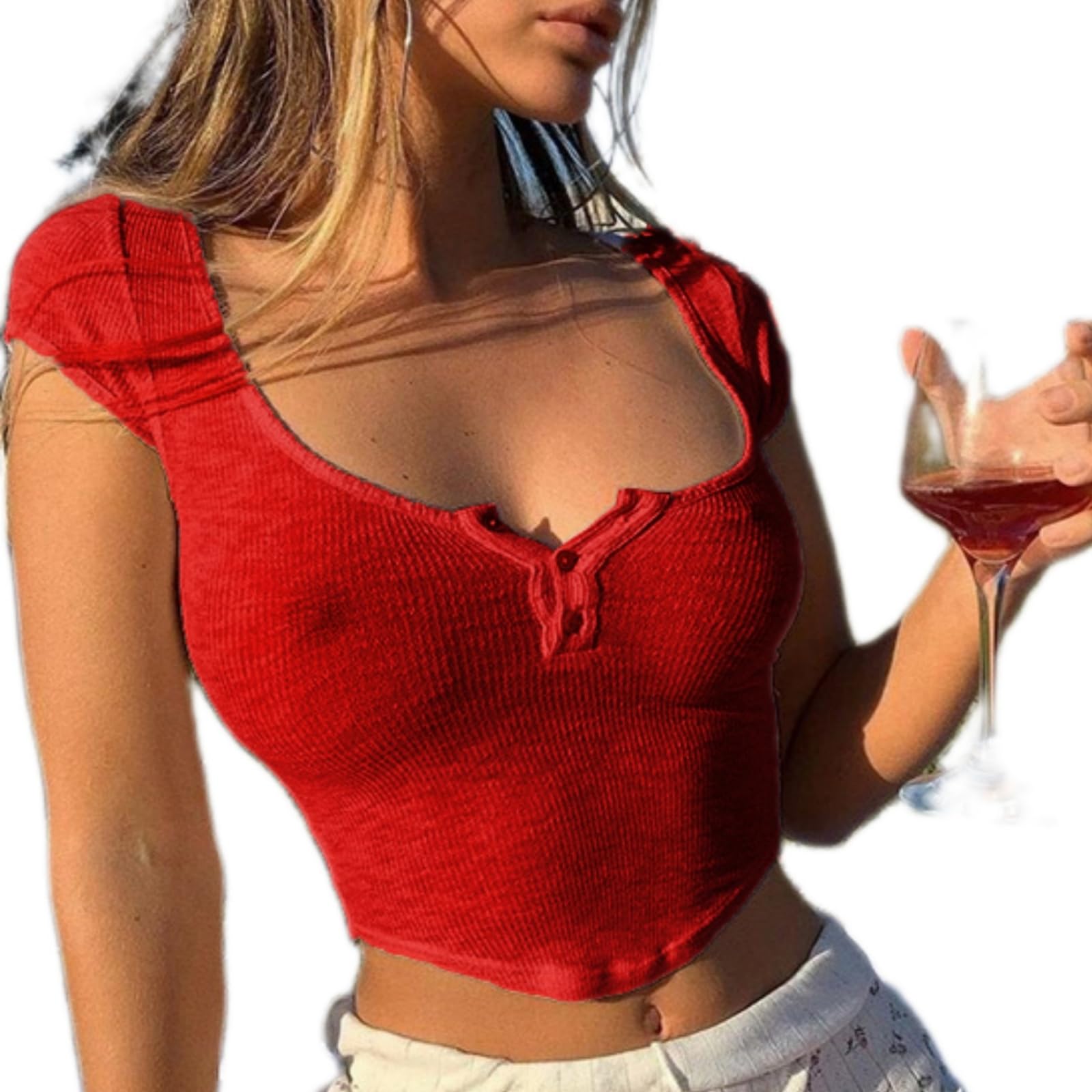 Woman's Fashionable Sexy Solid Color Top, Low-cut Short Sleeve Slim Midriff-baring Pullover, Daily Life Size(cm/inch):Size: S Bust: 66-86cm/25.98-33.86 inches Length: 41cm/16.14 inchesSize: M Bust: 70-90cm/27.56-35.43 inches Length: 42cm/16.54 inchesSize: L Bust: 74-94cm/29.13-37.01 inches Length: 43cm/16.93 inches Friendly Tips:1. Please kindly allow 2-3% difference according to manual measurement.2. Please check the measurement chart carefully before you buy the item. (1 inch = 2.54 cm)3. Please note that slight color difference should be acceptable due to the light and screen. Specifications:Size: S, M, LColor: WhiteGender: WomanOccasion: Daily Package Contents:1 x Sexy midriff-baring top Promise:If the product has any quality problems, please feel free to contact us, we will help you solve the problem as quickly as possible. Material: Women's see-through short tops are made of 5% cotton and 95% polyester. The fabric is skin-friendly, soft and comfortable to wear. Good elasticity, breathable and thin; give you the ultimate wearing experience in summer Features: Women's low-cut sexy tops, y2k style short tops, navel-baring short tops, see-through, ultra-short sleeves, sexy and charming, slim fit, waist-tightening; sexy and cute summer T-shirts highlight your perfect body curves Matching: Women's see-through babytees are very suitable for matching with high-waisted denim shorts, denim trousers, skirts, casual pants, etc.; to create a y2k street style, it is a must-have short top in the wardrobe Occasions: Women's short sexy tops are suitable for home, party, travel, beach, vacation, carnival, club, nightclub, evening party, street wear, school, shopping, dating, bar and other occasions. Rave tops for women, sexy tops for women Clothing care: It is recommended to hand wash or machine wash in cold water, wash separately from other clothes to avoid staining; then hang to dry, do not bleach. crop tops for women,corset tops for women,sheer tank tops for women,slutty tops for women