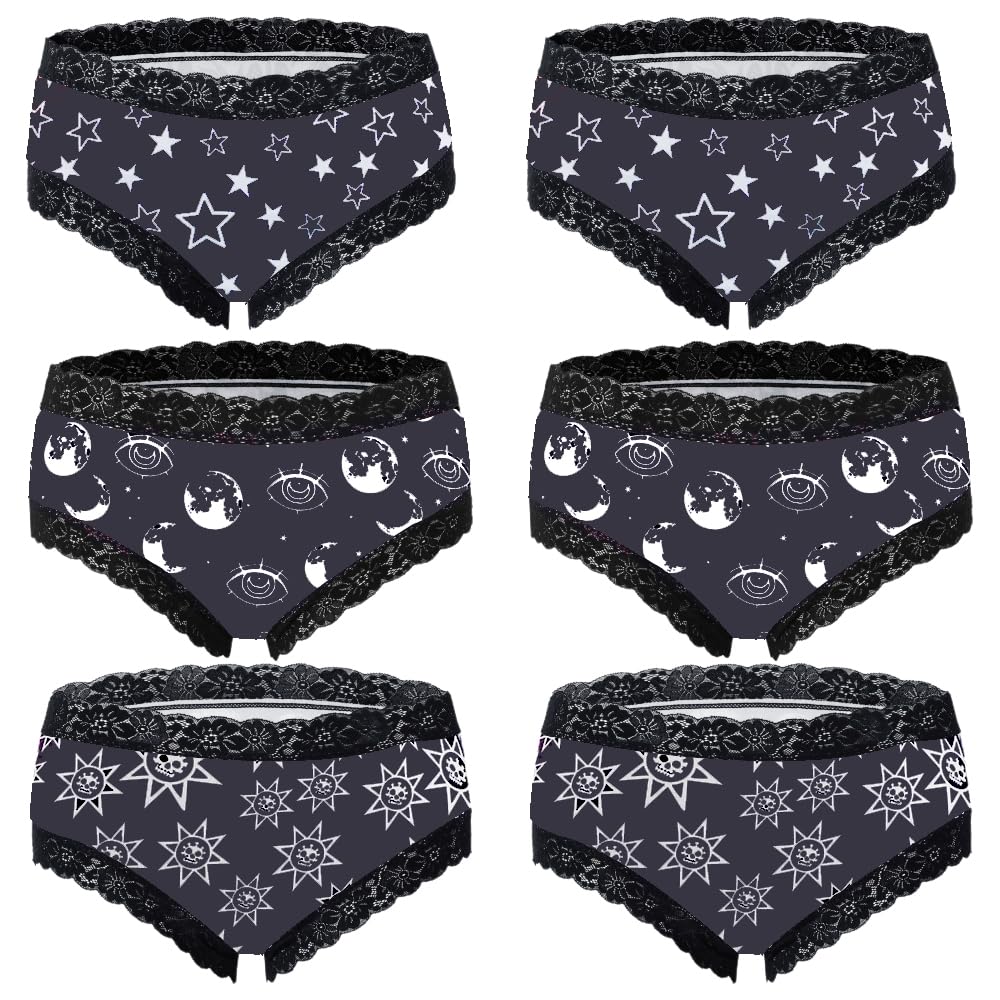 Embrace your edgy, gothic style with these chic low-rise bikini panties. Crafted with a contrast lace trim, these hipster panties feature bold skull, eyeball, and star prints that add a touch of rebellious flair. Available in an assortment of eye-catching designs, these comfortable underwear make a perfect gift for special occasions or everyday wear. Indulge in the allure of dark fashion while enjoying a flattering fit. ❤6-PACK VALUE SET: Includes six hipster-style briefs featuring a variety of bold gothic and Halloween-inspired prints ❤GOTHIC DESIGNS: Choose from skull and crossbones, moon phases, roses with skulls, ghosts, bats, and more spooky-chic patterns ❤LACE TRIM DETAIL: Each pair is finished with decorative lace trim along the waistband and leg openings for a feminine touch ❤HIPSTER CUT: Low-rise, full-coverage hipster brief style offers a comfortable and flattering fit for everyday wear ❤GREAT GIFT IDEA: Perfect for Halloween enthusiasts, gothic fashion lovers, or anyone who loves edgy, unique underwear styles