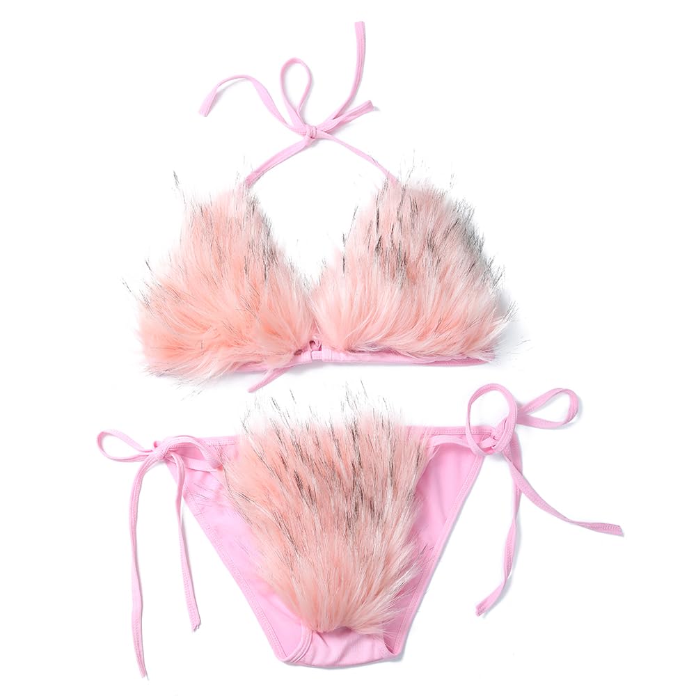ZOSCGJMY Women's Faux Fur Halter String Triangle Bikini Sets Two Piece Swimsuits: One Size Pink-4