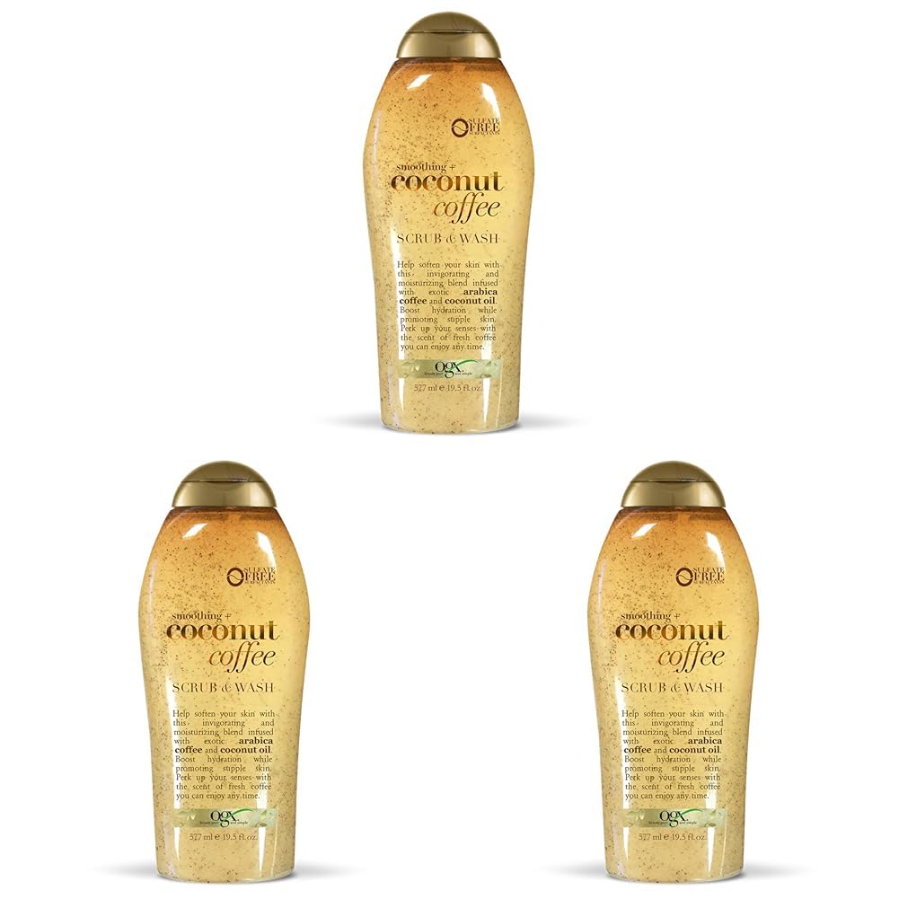 Renew and moisturize to reveal your most beautiful looking skin with OGX Smoothing + Coconut Coffee Exfoliating Body Scrub & Wash. The unique formula of this daily body wash works to slough away dry skin leaving it feeling soft and smooth with a healthy-looking glow. Both paraben- and sulfate-surfactant free, its unique formula is infused with exotic arabica coffee to help promote moisture and awaken skin, while coconut oil helps boost hydration and add luster and softness. Its invigorating aroma of rich coffee perks up the senses while you escape to a land faraway. Use daily by massaging this coffee body scrub all over wet skin, concentrating on areas that need extra exfoliation. For best results, use with OGX Smoothing + Coconut Coffee Body Cream as part of your skin care routine for added daily moisture. EXFOLIATING BODY SCRUB: 19.5-fluid ounce bottle of OGX Smoothing plus Coconut Coffee Exfoliating Body Scrub and Wash is blended with exotic arabica coffee and coconut oil to help soften and hydrate your skin SMOOTHS and SOFTENS: Indulge in the richness of coffee and coconut oil with this exfoliating and moisturizing body wash formulated to slough away dry skin for skin that's left feeling silky smooth COFFEE and COCONUT OIL BLEND: Its unique formula is infused with arabic coffee to awaken the skin for a healthy-looking glow while coconut oil adds luster and softness for beautiful-looking skin RICH, INVIGORATING SCENT: Transport yourself to a land far away and perk up your senses with the captivating scent of refreshing coffee that leaves behind a light scent to help jump start your day BYE-BYE DRY SKIN: Both paraben- and sulfate surfactant-free, our exfoliating coffee body scrub is suitable for daily use so you can say bye-bye to dry skin For best results, use with OGX Smoothing plus Coconut Coffee Body Cream for added moisture