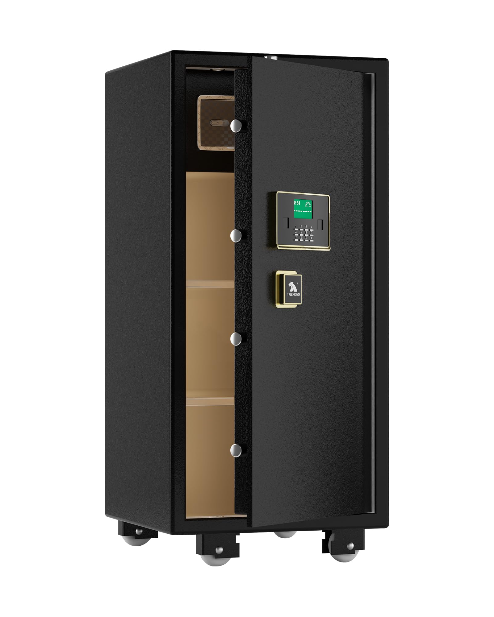 TIGERKING 5.9 Cubic Feet Extra Large Heavy Duty Safe Box, Big Home Safe with Double Safety Key Lock and Separate Lock Box, Digital safe with 2 Removable Shelf for Home Hotel Office ⭐⭐⭐⭐⭐【US STOCK】: Our large safe is in stock in the US 【Extra Large Security Safe Box】:Our extra-large security safe weighs 108 pounds, so it's hard for anyone to steal it. It features a 75mm extra-thick explosion-proof steel door, 6*25mm high-strength solid locking bolts and pry-resistant concealed hinges, guaranteeing top-notch security for your valuables. For added protection, the safe can be anchored to the wall using expansion screws. 【Large Steel Home Safe】: The extra large heavy duty cabinet safe Dimensions of the safe: (D)17.7 X (W)15.6X (H)40.2 in, the inner Dimensions: (D)17.3X (W)11.2 X (H)28.4in; large capacity with 2 removable shelves make the safe can be easily loaded to store valuables such as jewelry, documents, money, etc. 【Anti-Theft Alarm System & Hidden Code】: Our large home safe has anti-theft alarm systems.Violent vibration or Three- incorrect entries can activate the alarm system by sounding for 60 seconds. Security Safe can keep max 35 opening records and allows you to program your code with 1-8 digits; Dial “*” before entering the code can active the secure display feature (the code you enter will not be shown on the screen) 【Removable Shelf & Lock Box】: The inside of the big safe is covered with leather to prevent valuables from being worn. Removable shelves allow you to move up and down to accommodate the items you want to store. The digital safe has an interior box with a lock, even if you need to share your safe with others, you still can have a secure place to load your valuables. 【Enhanced Dual Key Security】:Tigerking safe has a dual safety key unlocking function, dual key unlocking increases security. Two methods are available for unlocking: 1. Dual key unlocking; 2. Master key + password unlocking, NOTE: The master key is always needed to open the safe, with this design, even if someone gets your code, without the master key, they still can not access the safe. 【Convenient Removable Wheels】: Our TIGERKING heavy-duty safety deposit box comes with removable wheels to simplify its relocation. Once in place, the wheels can be detached and the safe fixed to a wall, significantly boosting its anti-theft capabilities. 【Satisfactory After-Sales Service】: Tiger King Safe provides a one-year warranty and 24-hour online customer service, providing customers with value-for-money and worry-free services. 【Return Policy】: 30% restocking fee will be charged for the returning with non-quality issues.The wheels are only used to move the safe during the transport, they are part of packing materials ,they are not included in the warranty. For security consideration , please do remove the wheels after you receive the safe.